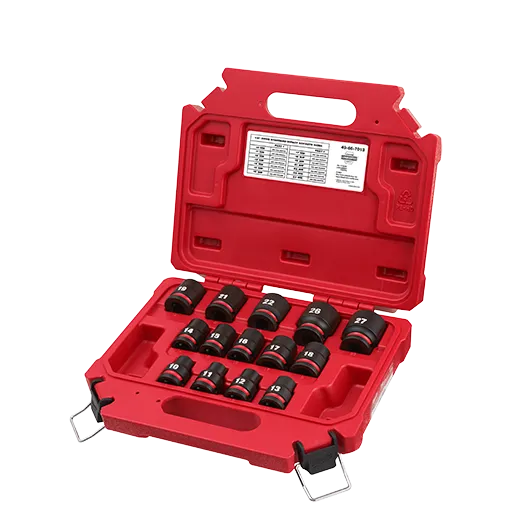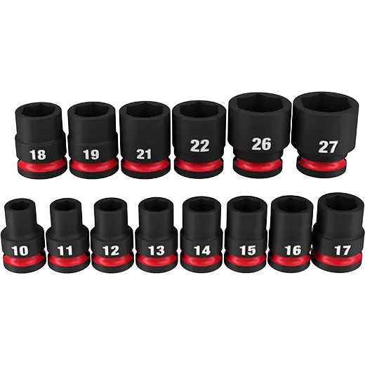 - Le kit comprend 14 douilles métriques standard. Les tailles suivantes sont incluses : 10, 11, 12, 13, 14, 15, 16, 17, 18, 19, 21, 22, 26, 27