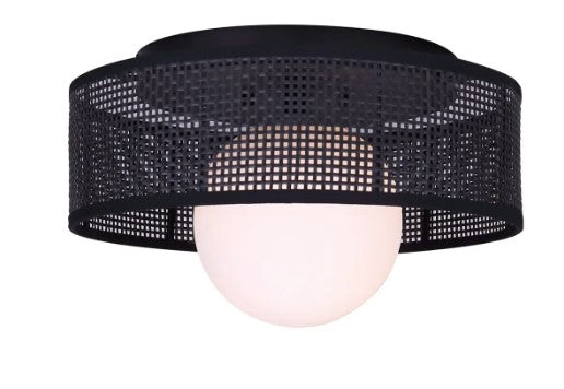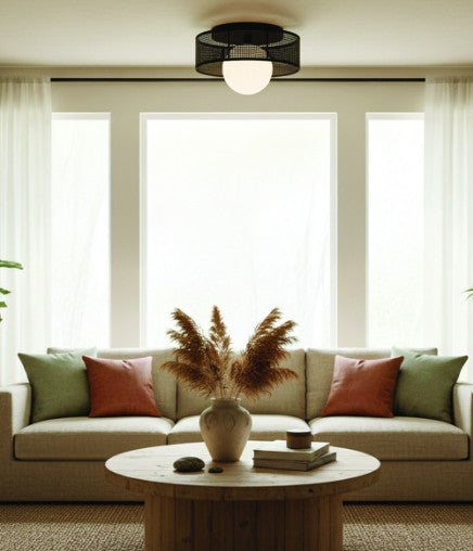 The THANE 1-light flush mount blends natural texture with contemporary design, featuring a bold black rattan shade and softly diffused opal glass globe. Its sculptural form introduces a touch of nature into modern spaces, creating restorative, organic warmth. The matte black finish adds definition while maintaining a clean, balanced look. Ideal for bedrooms, hallways, or living spaces, THANE brings subtle sophistication and calm energy to your home. Easy Connect ensures quick installation for builders and DIYers alike.
