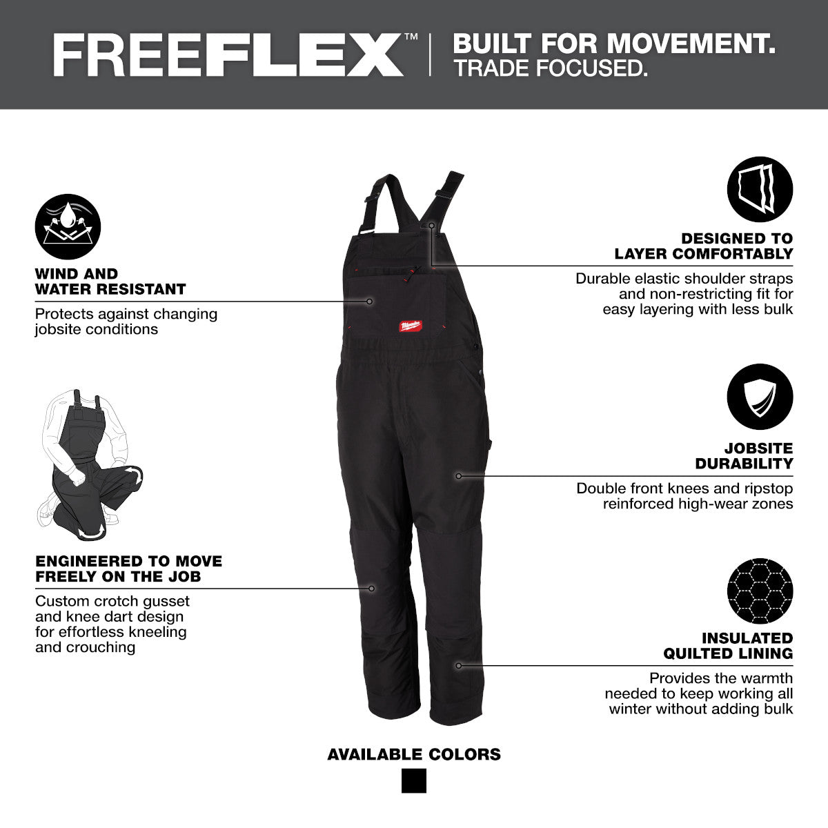 Faisant partie de la collection MILWAUKEE® FREEFLEX™, les salopettes isolées sont CONÇUES POUR LE MOUVEMENT. Nos bavoirs isolés FREEFLEX™ sont conçus pour se déplacer librement sur le chantier avec un soufflet d'entrejambe personnalisé et des genoux articulés. Ces bavoirs isolés durables sont conçus avec une doublure matelassée et une protection contre le vent et l'eau pour travailler dur par temps froid. Des matériaux plus légers et plus durables maximisent la mobilité en réduisant l'encombrement et en éliminant le temps de rodage. Les produits Milwaukee FREEFLEX™ sont développés en collaboration avec les commentaires des utilisateurs de tous les métiers grâce à des recherches continues sur les chantiers.