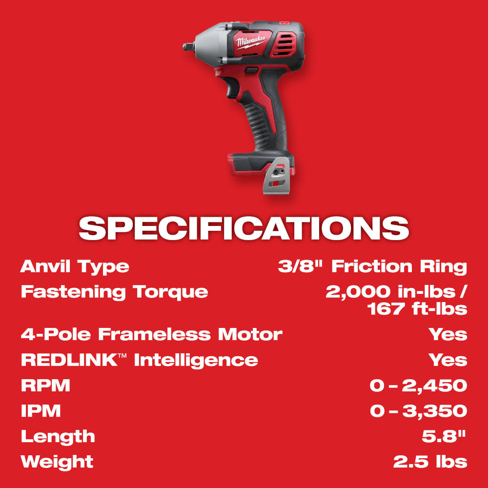 La clé à chocs compacte sans fil M18 de 3/8 po est la plus puissante de sa catégorie et offre le meilleur rapport puissance/taille parmi ses concurrents. Dotée d'un moteur sans cadre 4 pôles Milwaukee et d'un mécanisme de percussion optimisé, cette visseuse à chocs offre jusqu'à 2 450 tr/min, 3 350 ipm et un couple de serrage de 167 pi-lb pour des performances de pointe. La technologie REDLINK Intelligence optimise les performances et la protection contre les surcharges grâce à une communication totale entre l'outil, la batterie et le chargeur. La clé à chocs compacte sans fil M18 de 3/8 po est équipée d'une bague de friction de 3/8 po pour un changement de douille rapide et sans outil, d'un éclairage LED pour éclairer les surfaces de travail et d'un clip ceinture réversible entièrement métallique pour le rangement temporaire de l'outil.