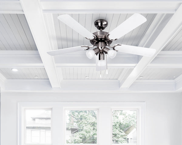 Le ventilateur de plafond Omni de 42 pouces fournit un éclairage suffisant pour vos besoins quotidiens tout en ajoutant une couche de style classique au décor de votre maison. Le style transitionnel du ventilateur de plafond Omni est évident dans sa symétrie épurée et ses éléments de conception solides. Doté d'une finition en étain brossé avec des abat-jour en verre givré tourbillonnant et 5 pales réversibles grises et blanches, le ventilateur de plafond Omni s'adaptera à de nombreux décors d'éclairage différents.