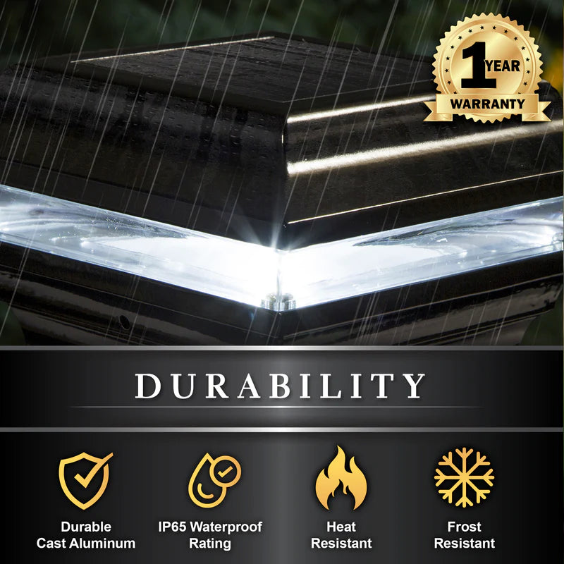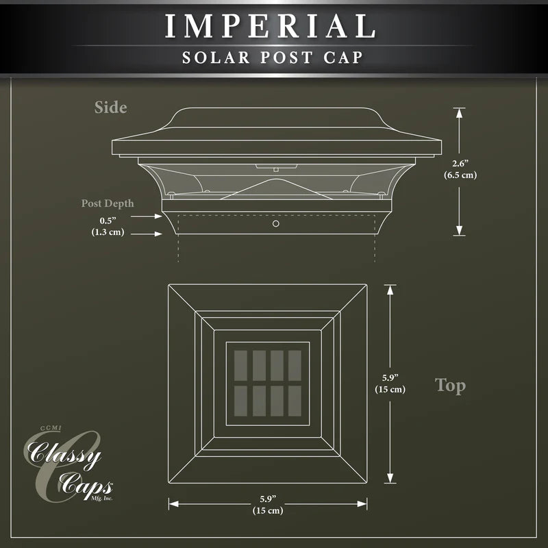 Le capuchon de poteau solaire Imperial, moderne et élégant, offre un design contemporain épuré dont la performance est inégalée. Sa construction robuste en fonte d'aluminium avec finition thermolaquée signifie qu'il n'y aura aucune peinture future. L'Imperial s'adapte sur un poteau réel de 4"x4" ou 3,5"x3,5" (adaptateur 3,5"x3,5" inclus).
