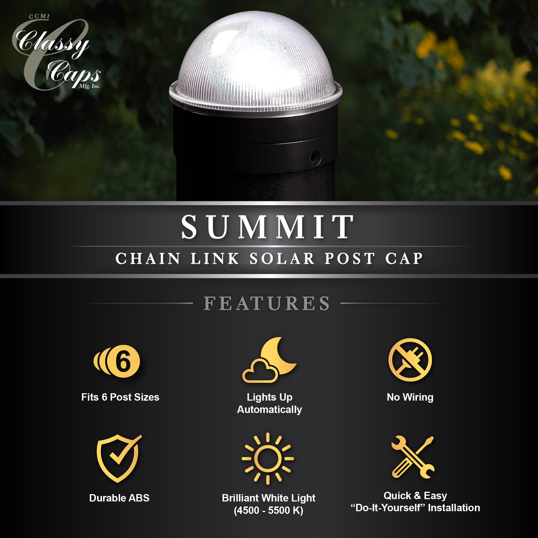 Ajoutez une touche de classe à votre clôture à mailles losangées avec notre capuchon de poteau solaire Summit haute performance. Ce design unique en son genre de Classy Caps complétera vos poteaux à maillons de chaîne existants. S'allume automatiquement chaque nuit, projetant une lumière blanche brillante sur la zone environnante. Fabriqué pour s'adapter à six poteaux de clôture à mailles de chaîne standard - 3" de diamètre, 2-7/8" de diamètre, 2,5" de diamètre, 2 à 3/8" de diamètre, 2" ou 1-7/8" de diamètre.