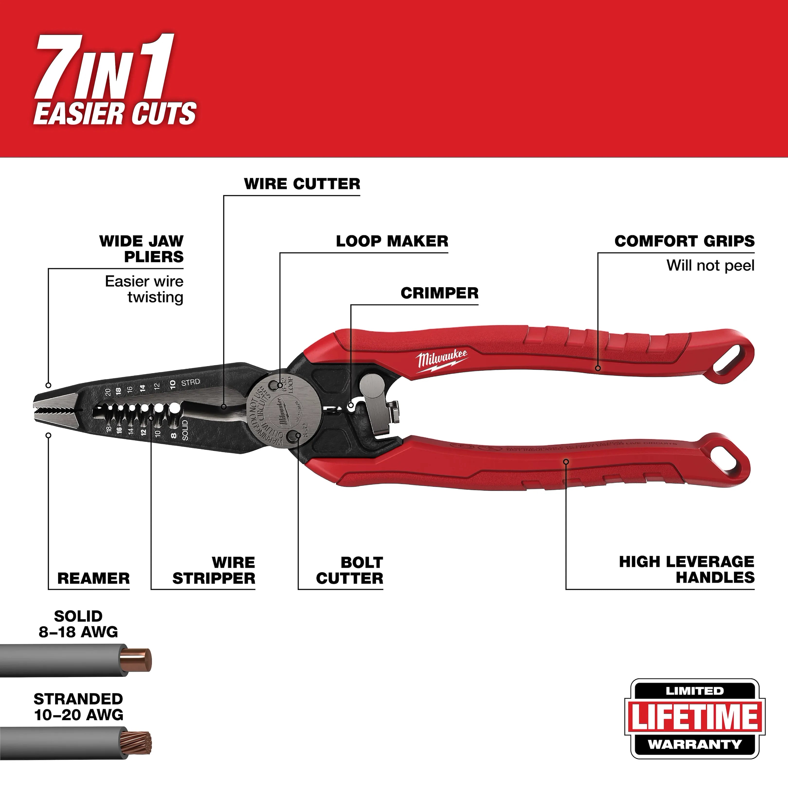 La pince universelle 7-en-1 à fort effet de levier offre sept fonctions essentielles pour les installations électriques. La pince à larges mâchoires facilite la saisie et la torsion des fils, tandis que la pince à sertir offre des fonctionnalités supplémentaires pour travailler avec des cosses isolées et non isolées. Le coupe-fil, la pince à dénuder et le dispositif de création de boucles permettent une préparation rapide des fils. L'alésoir intégré permet d'aléser des conduits de 1,27 cm à 2,54 cm, tandis que le coupe-boulons coupe les boulons n° 6 et n° 8. Son système de verrouillage pivotant permet une utilisation rapide d'une seule main, et ses poignées à fort effet de levier facilitent la coupe et le sertissage. La pince électrique 7-en-1 MILWAUKEE® offre une productivité maximale et est idéale pour les chantiers les plus exigeants.