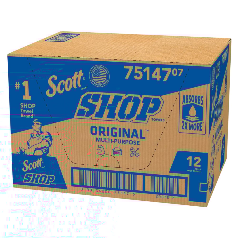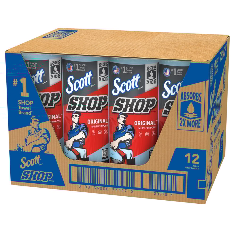 Les serviettes d'atelier Scott® Shop Towels Original™ sont fabriquées par Scott®, la marque de serviettes d'atelier n°1. Ces serviettes d'atelier bleues absorbent 2 fois plus que les serviettes en papier de marque de premier ordre pour vos tâches quotidiennes. Les serviettes d'atelier Scott® Shop Towels Original™ sont douces, absorbantes et peuvent être utilisées pour nettoyer les déversements d'huile, changer l'huile, remplir les liquides et autres travaux d'entretien automobile généraux. Elles peuvent également être utilisées pour absorber les déversements et fuites de liquide importants, le nettoyage et l'entretien de routine et l'élimination des saletés et des liquides du visage et des mains (ne pas utiliser sur une peau fragilisée). Disponibles en format rouleau ou en boîte Pop-Up™ avec une poignée intégrée, ces serviettes perforées en tissu sont portables pour les travaux en déplacement. Que vous possédiez un garage automobile, que vous soyez un bricoleur du week-end ou que vous travailliez à la maison, ne faites confiance à personne d'autre qu'à la serviette d'atelier bleue originale, Scott® Shop Towels Original™, fabriquée par Scott®, la marque de serviettes d'atelier n°1 (Circana, Retail Tracking Service, ventes aux États-Unis, 2021 et 2022.)