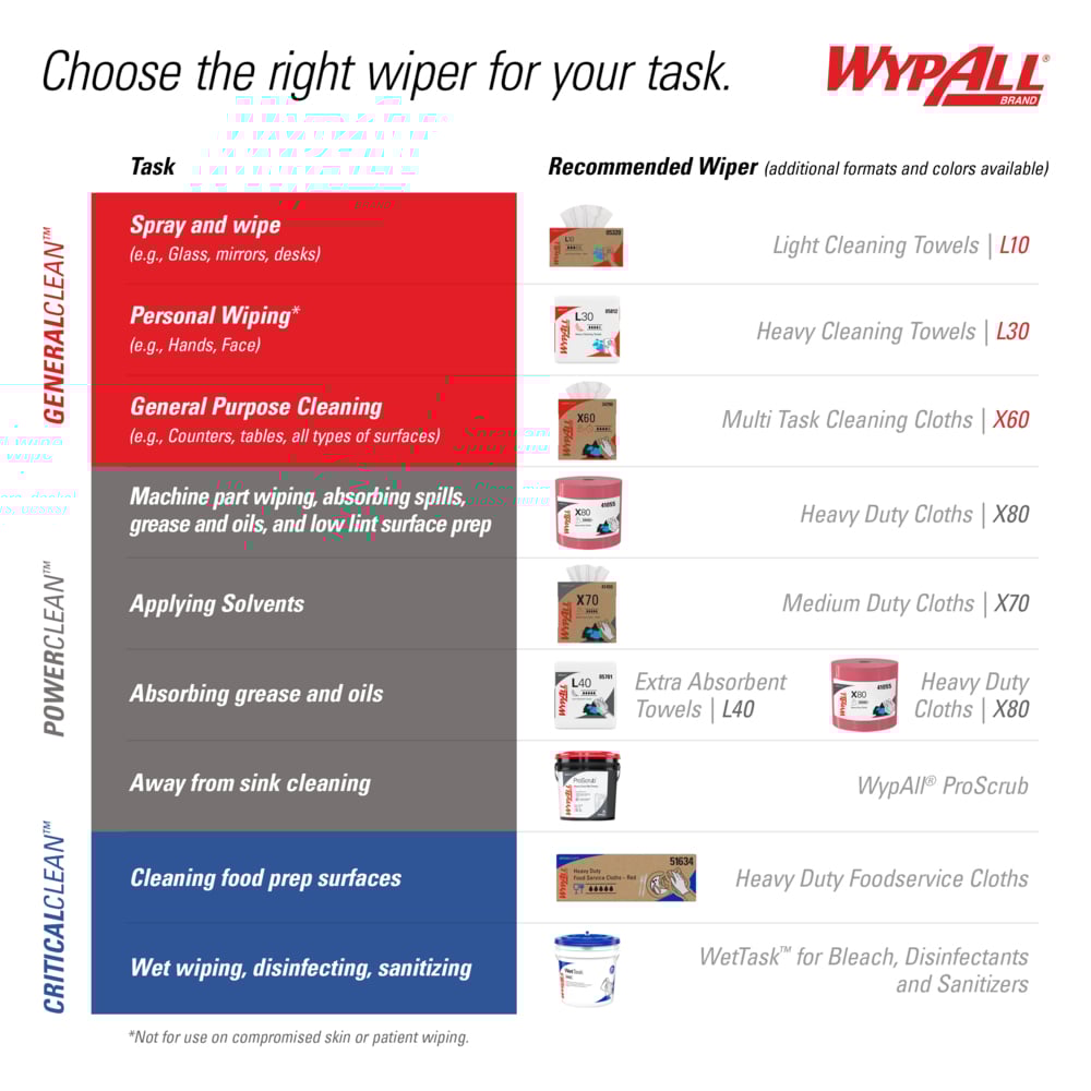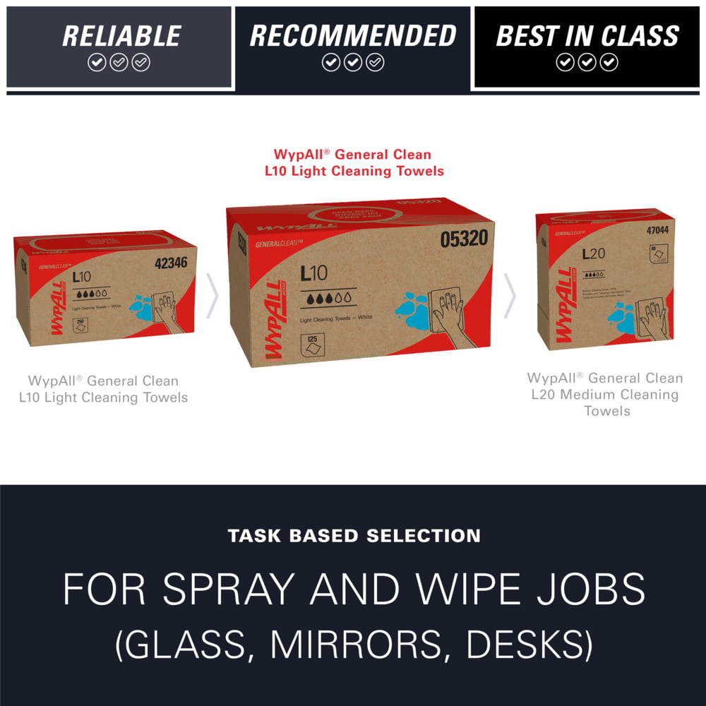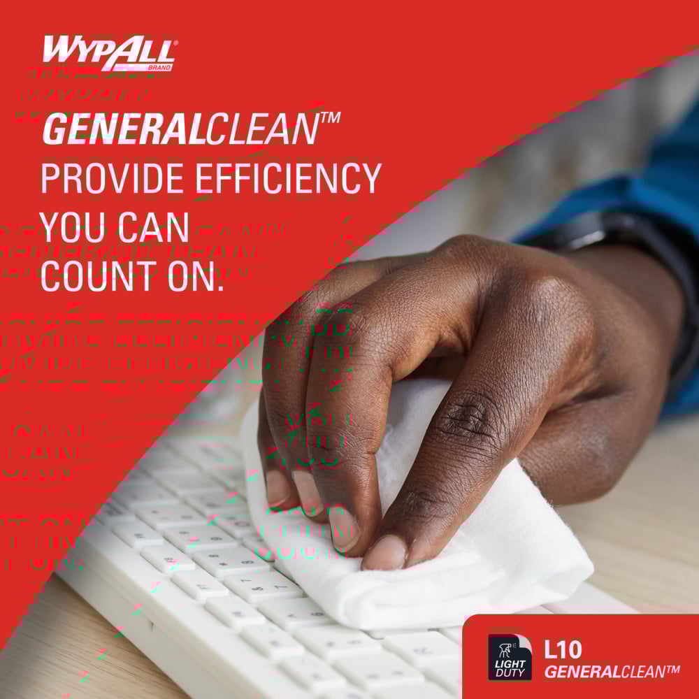 WypAll® est la marque numéro un de lingettes jetables aux États-Unis et au Canada. Créez un environnement de travail propre avec des solutions de nettoyage général à usage léger. Lorsque vous avez besoin d'une serviette légère pour obtenir des résultats à un prix économique, les serviettes de nettoyage léger WypAll® GeneralClean™ L10 sont un excellent choix. Ce sont d'excellentes serviettes de nettoyage de remplacement pour les travaux de pulvérisation et d'essuyage, le nettoyage des surfaces vitrées, l'absorption de petits déversements de liquide, l'essuyage des détails et de l'assemblage final. Vous trouverez ces serviettes jetables dans les activités d'entretien ménager dans l'hôtellerie, le nettoyage de la vente au détail et les activités de nettoyage léger en général. Étant donné que ces serviettes offrent de meilleures performances de séchage que les serviettes en papier, vous obtenez de meilleures performances de séchage qui peuvent réduire l'utilisation globale. Les serviettes de nettoyage léger WypAll® GeneralClean™ L10 sont un remplacement formidable et fiable des serviettes en papier et peuvent ajouter de l'efficacité à votre entreprise. Ces serviettes répondent aux directives de l'EPA pour la teneur en fibres recyclées. Elles sont un outil de confiance pour vous aider à faire le travail correctement.