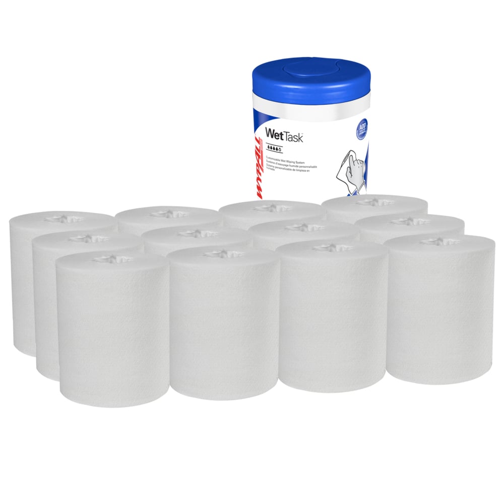 - 55 feuilles/rouleau ; 12 rouleaux de lingettes WypAll® CriticalClean™ WetTask™ pour eau de Javel, désinfectants et assainisseurs/caisse ; 660 feuilles/caisse ; blanc ; rouleau à tirage central ; bidon inclus