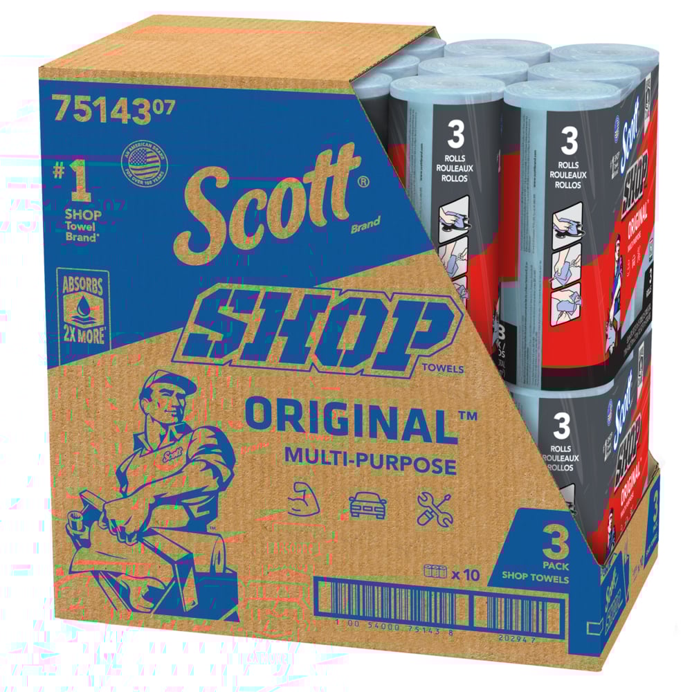- 55 serviettes/rouleau; 30 rouleaux de serviettes d'atelier Scott® Original™/caisse; 10 paquets de 3 rouleaux; 1 650 serviettes/caisse; serviettes d'atelier bleues originales; feuilles de 9,4" x 11"