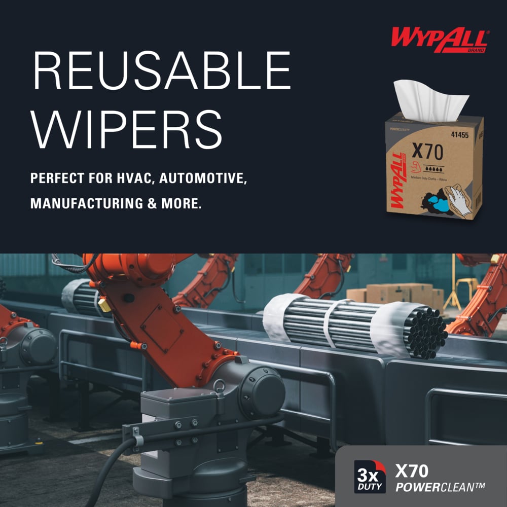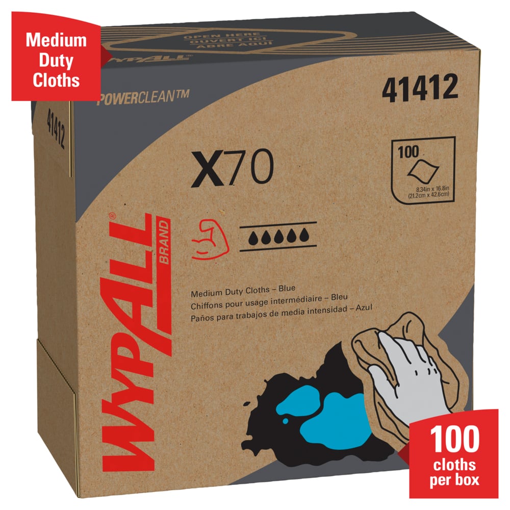 WypAll® est la marque numéro un de lingettes jetables aux États-Unis et au Canada. Maximisez les performances tout en minimisant le temps, les efforts et le gaspillage de produits. Si vous utilisez des serviettes d'atelier lavées ou des chiffons d'atelier en textile, vous pouvez faire confiance aux chiffons WypAll® PowerClean™ X70 Medium Duty. Ce sont des chiffons très résistants, avec un matériau à absorption rapide Hydroknit® de haute technologie. Les chiffons industriels haut de gamme WypAll® PowerClean™ X70 Medium Duty Cloths sont fabriqués à partir de fibres de pulpe douces, liées à une feuille de base en polypropylène pour une absorption et une résistance à la déchirure, ce qui les rend adaptés à l'élimination de la saleté, de l'huile, de la crasse et des solvants dans une variété d'industries et de fabrication. De plus, ils sont si robustes qu'ils peuvent souvent être utilisés plus d'une fois (une fois que vous les avez utilisés plusieurs fois, ils sont jetables). Ils sont conçus pour nettoyer les surfaces et les outils, ce qui en fait un incontournable pour les industries du CVC, de l'automobile, de la fabrication et de l'industrie. Lorsque vous dirigez une entreprise, il est payant d'utiliser les meilleures fournitures et WypAll® fait l'affaire.
