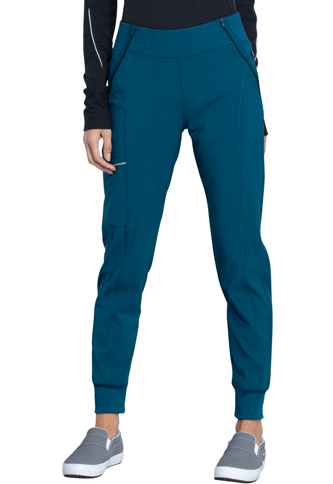 Un pantalon de jogging de coupe contemporaine, à taille mi-haute, doté d'une taille élastique en tricot côtelé avec des poches avant zippées en biais, une poche cargo avec bande réfléchissante, deux poches plaquées à l'arrière, des bandes de jambe en tricot côtelé pour une longueur réglable et des détails de surpiqûre partout. Entrejambe : 28 1/2". Le tissu en popeline extensible confortable et le tricot côtelé super extensible sont la combinaison parfaite pour les professionnels de la santé.