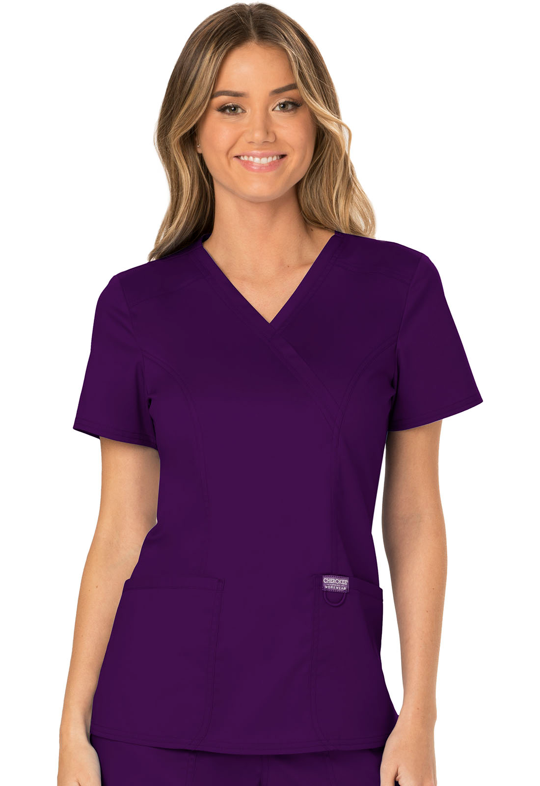 Un haut cache-cœur de coupe classique moderne comprend des empiècements aux épaules sur le devant, deux poches plaquées, une boucle pour instrument, une étiquette logo avec boucle élastique, des coutures princesse à l'avant et à l'arrière et des fentes latérales. Longueur au milieu du dos : 26"