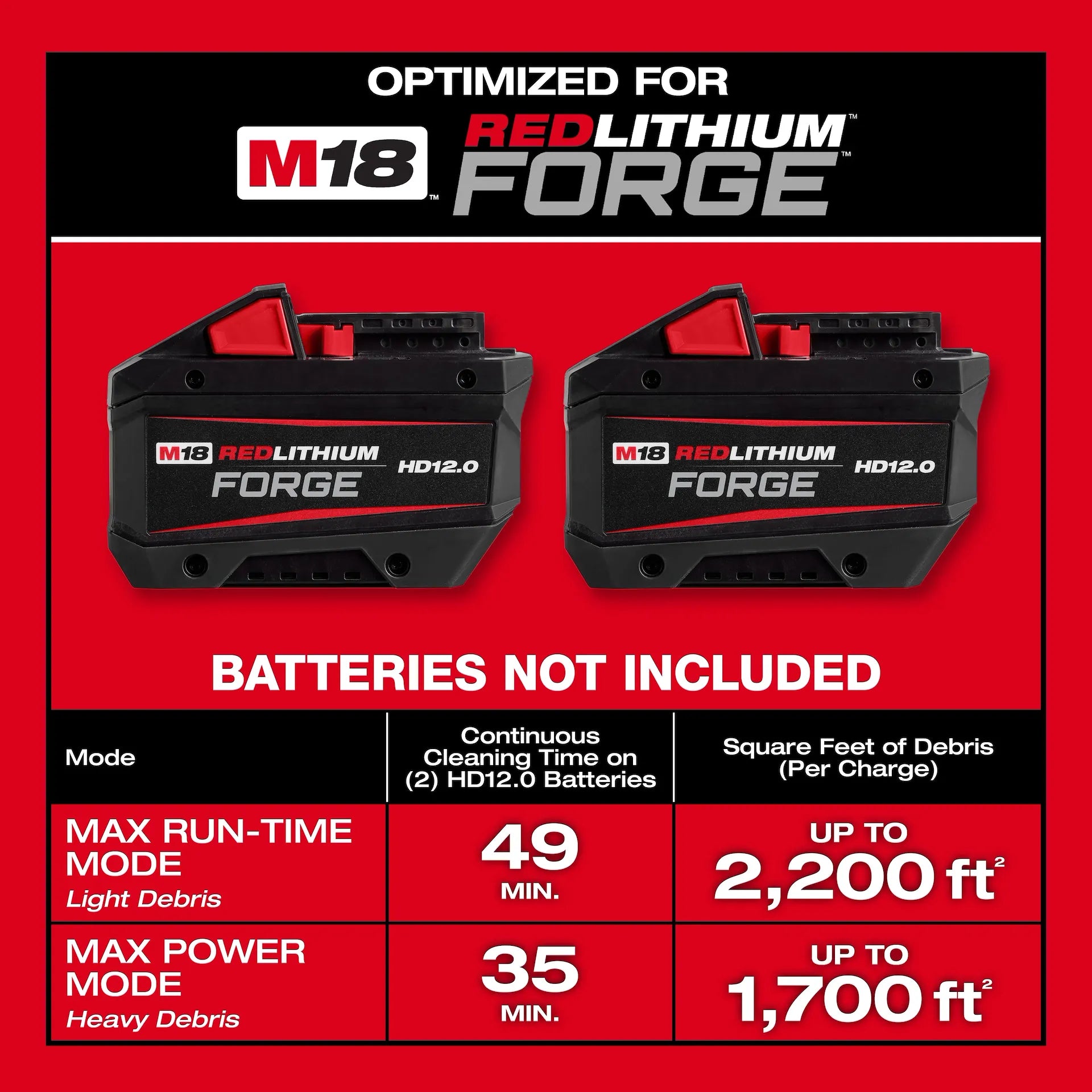 - Le mode d'autonomie maximale offre jusqu'à 49 minutes de nettoyage continu et jusqu'à 2 200 pieds carrés de débris à nettoyer par charge sur (2) blocs-batteries M18 REDLITHIUM™ FORGE™ HD12.0