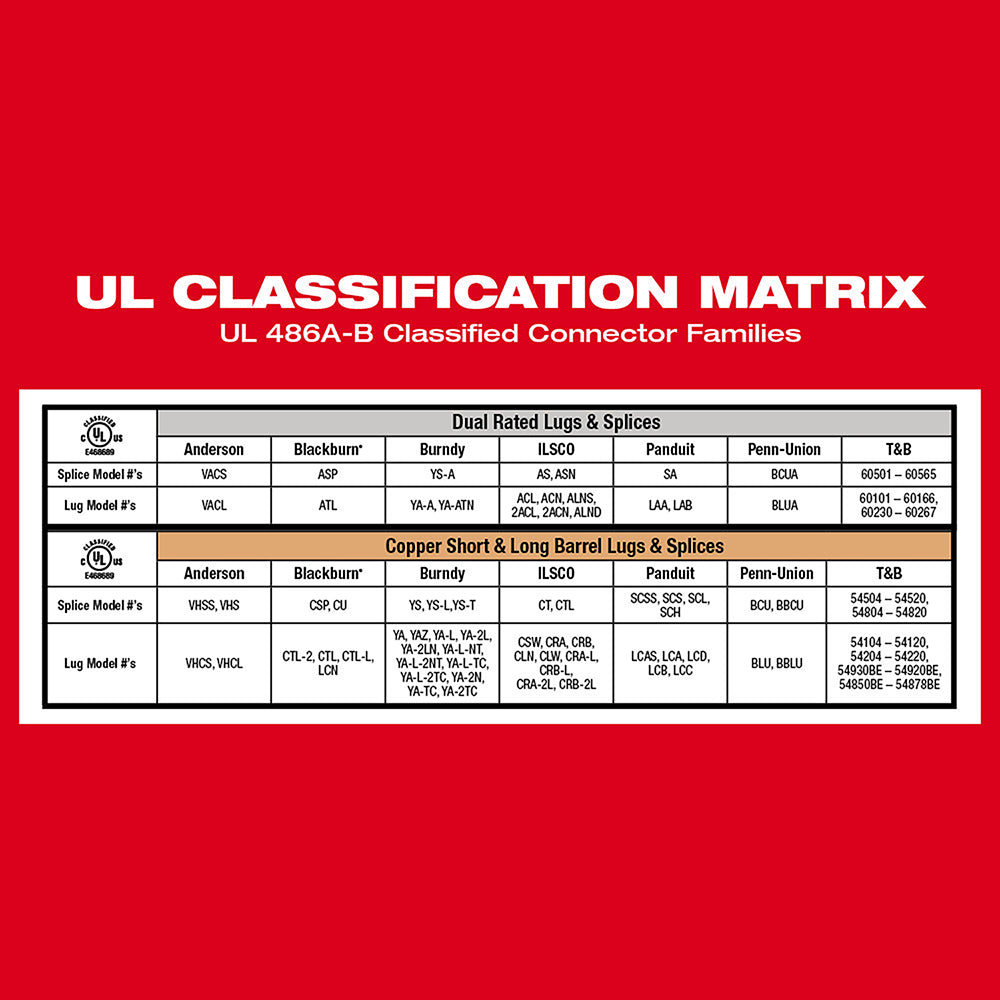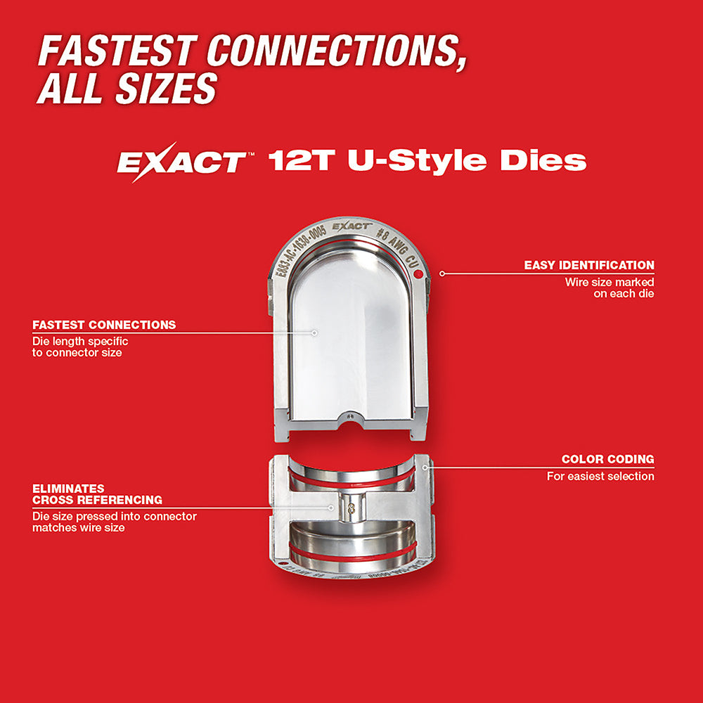 La pince à sertir M18™ Force Logic™ 750 MCM est le moyen le plus simple de sertir, produisant des sertissages classés cULus conformément aux normes de classification UL 486A-B pour les connecteurs Cu #8 - 750 MCM et Anderson, Blackburn® Burndy, Ilsco, Panduit, Penn-Union et Thomas & Betts à double classification. Les matrices Milwaukee® EXACT™ 12T U-Style sont conçues individuellement pour des sertissages de qualité et pour des connexions plus rapides sur toutes les tailles avec des longueurs de matrice spécifiques à chaque connecteur. De plus, chaque matrice EXACT™ 12T U-Style présente des couleurs vives conformes aux normes industrielles pour indiquer la taille du fil et les marquages d'alignement central pour une sélection et un alignement plus faciles des matrices. Toutes les matrices éliminent également les références croisées en imprimant la taille du fil sur les connecteurs terminés et sont les seules matrices qui sont sérialisées et mesurées à 100 % pour une précision maximale et une inspection plus facile.