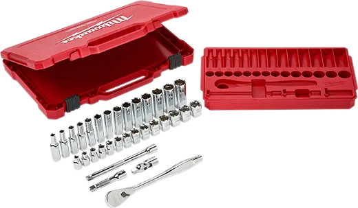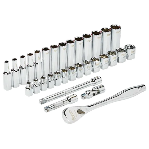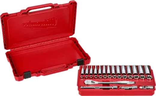 Le jeu de 32 douilles et cliquets MILWAUKEE® SAE 3/8" est conçu dès le départ, offrant à nos utilisateurs les douilles les plus polyvalentes, anti-roulement et prêtes à l'emploi. Ses quatre côtés FOUR FLAT™ innovants présentent une conception anti-roulement et prête à l'emploi. L'outil à cliquet à 90 dents offre un arc de rotation de 4° et une conception à profil mince, vous permettant de travailler dans des espaces plus étroits et plus confinés, que ce soit sous le capot d'une voiture ou au milieu d'un remodelage. Le kit de cliquet et de douilles est livré avec un plateau intérieur amovible qui est parfaitement conçu pour être stocké à long terme dans un coffre de rangement en acier. Toutes nos douilles sont estampillées avec des mesures métriques sur le côté plat pour une visibilité facile à lire. L'ensemble est livré avec des accessoires inclus afin que nos utilisateurs puissent effectuer chaque travail, à la fois dans le garage et sur le chantier. Notre jeu de cliquets et de douilles est couvert par notre garantie à vie.