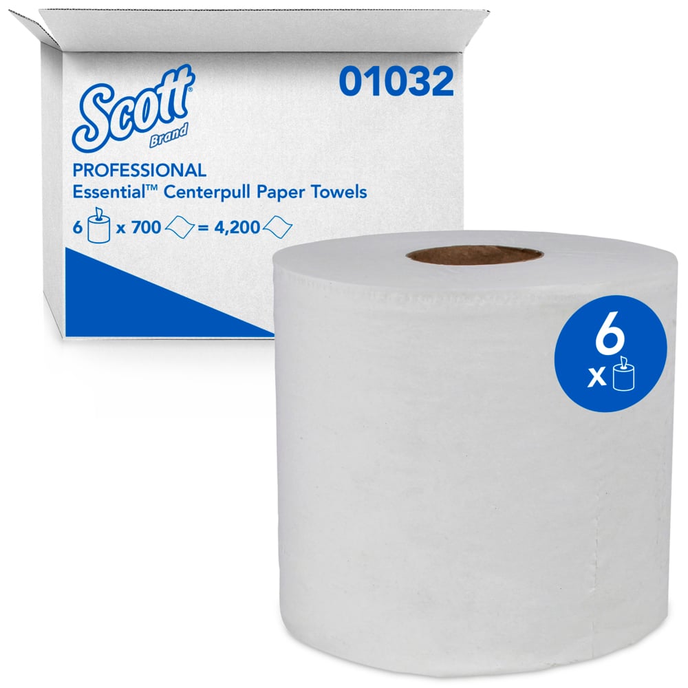 - 700 feuilles/rouleau, 6 rouleaux d'essuie-mains à tirage central Scott® Essential/caisse, 4 200 feuilles/caisse ; avec poches absorbantes à séchage rapide™ ; blanc ; essuie-mains perforés de grande taille ;