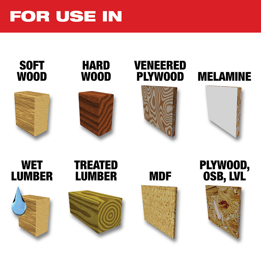 - Idéal pour une utilisation avec : les bois tendres, les bois durs, la mélamine, le MDF, les contreplaqués plaqués, le bois humide, le bois traité et les bois laminés tels que le contreplaqué, l'OSB, le LVL, le PSL, le LSL et l'OSL
