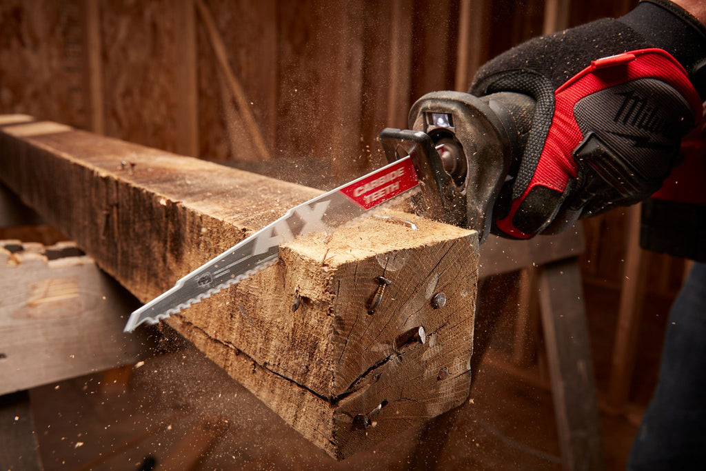 La lame AX™ à dents en carbure est conçue pour une durée de vie exceptionnelle, même dans les conditions les plus difficiles, tout en étant la lame de scie alternative à pointes en carbure la plus rapide du marché. Ces nouvelles lames offrent une durée de vie 50 fois supérieure à celle des lames bimétalliques standard et une vitesse de coupe 2 fois plus rapide que les autres lames en carbure. La lame AX™ à dents en carbure bénéficie d'une technologie de pointes en carbure optimisée pour une durée de vie extrême. Sa conception rapide et agressive à 5 TPI permet une coupe ultra-rapide du bois contenant des clous et d'une large gamme de matériaux résidentiels. De plus, la lame AX™ à dents en carbure intègre les technologies brevetées Milwaukee Nail Guard™ et Fang Tip™. Nail Guard™ permet d'arracher les clous sans endommager les dents, garantissant une durabilité extrême. Fang Tip™ offre la pénétration la plus rapide de toutes les lames pour la coupe du bois disponibles sur le marché. La lame AX™ à dents en carbure est optimisée pour les scies alternatives sans fil, offrant plus de 25 % de coupes supplémentaires par charge.