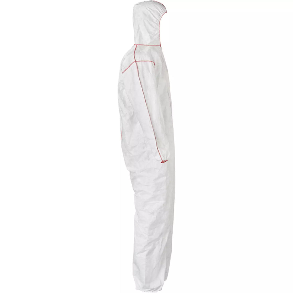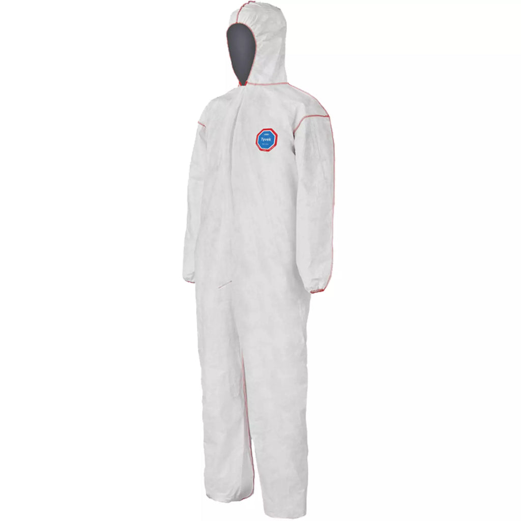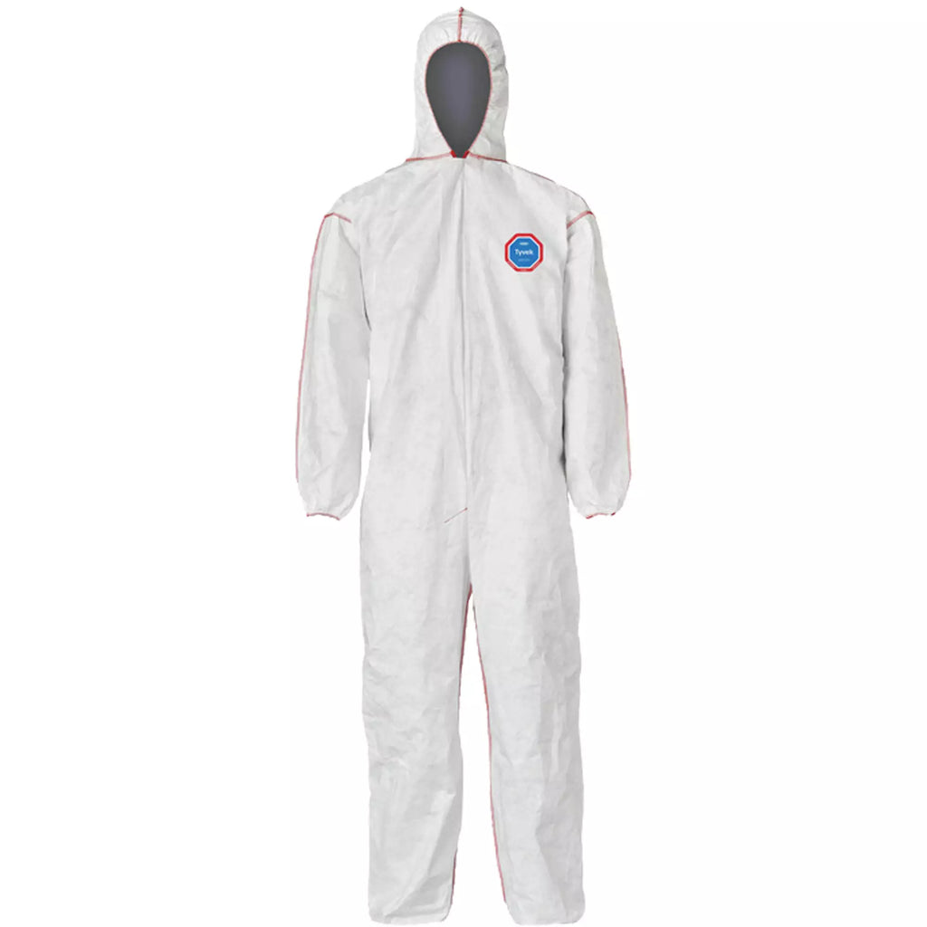Coveralls - DuPont Tyvek® 400 SFR Standard Fit Hood, Elastic Wrists & Ankles, Relaxed Fit, Storm Flap, Red Zipper, Red External Serged Seams, White (Case of 25) ST127