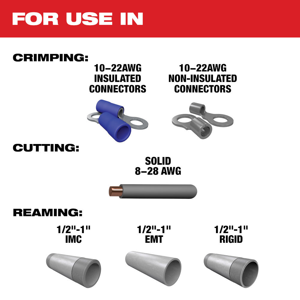 The Milwaukee Comfort Grip Crimping Pliers feature hardened jaws designed to deliver up to 2X the crimping force for insulated and non-insulated terminals. An integrated reaming head makes it easy to smooth out rough edges of metal pipe before installation. Milwaukee comfort handle grips will not peel or dig into hands during extended use.