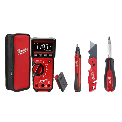 Milwaukee's Electrical Combo Kit includes four tools and accessories for the professional electrician working residential, commercial or industrial applications. The Digital Multimeter is True-RMS and includes all the features that are needed to get the job done in the field, on-site or in the plant. It includes High contrast white on black display for easy reading in all environments, CAT III 600V, up to 600V AC/DC, Lo-Z measurement to eliminate ghost voltage, frequency to 50kHz, and resistance to 40 Mohms. Our Voltage Detector with LED is a rugged tool with the highest safety rating in the industry, CAT IV 1000V with a wide 50 to 1000 volt AC range. It has a built-in LED that lights up any work area. Our FASTBACK™ Folding Utility Knife features a one-handed blade opening, tool-free blade changes, built-in wire stripping, and an integrated gut hook to cut without opening the knife. The 11in1 Multi-Bit Driver w/ ECX™ The 11 in 1 Screwdriver includes the 8 bits and 3 nut drivers most requested by professionals. Our ECX™ bit (patent pending) has a superior fit for specialty screws. Includes electrical test lead set, dual banana thermocouple, magnetic meter holder, soft meter case, all batteries for the Digital Multimeter and Voltage Detector, and all manuals.