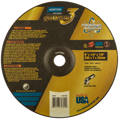 Maximize your production potential on stock removal projects while minimizing cost with the Quantum3 SG CA Type 27 grinding wheel. This 1/4-inch right-angle-grinder wheel provides an exceptional finish on 400-series stainless or hard and soft carbon steel materials. The ceramic alumina abrasive grain and bond system offer double the performance of competitive ceramic wheels, and an astonishing 500 percent increase in performance over aluminum oxide. Ramp up your production and see a positive impact to your bottom line. The user-friendly design means simple cutting action without grabbing, digging or catching, leading to a high-quality finish every time.