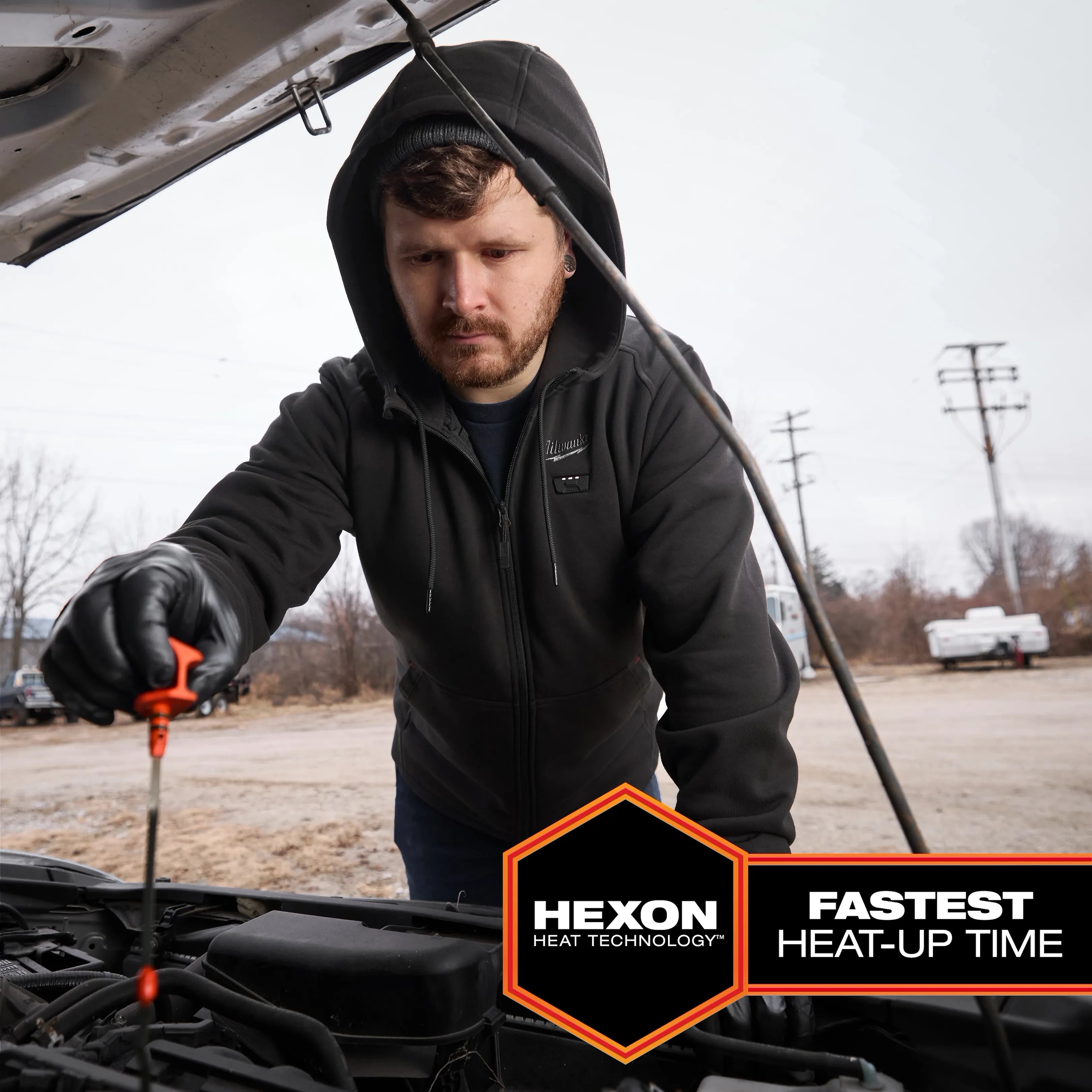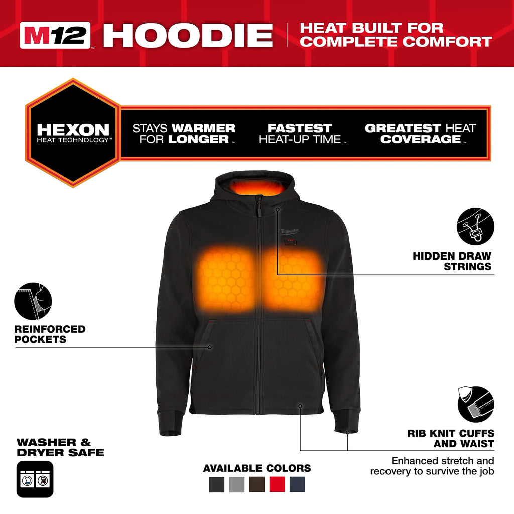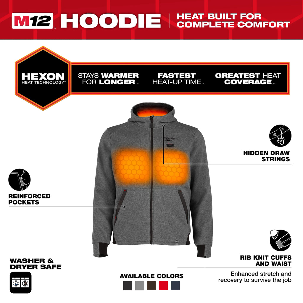 The MILWAUKEE® M12™ Heated Hoodie delivers HEAT BUILT FOR COMPLETE COMFORT. Powered by Milwaukee’s NEW HEXON HEAT TECHNOLOGY™, this hoodie STAYS WARMER FOR LONGER in all temperatures, delivers the FASTEST HEAT UP TIME and offers the GREATEST HEAT COVERAGE throughout the garment. Whether facing freezing outdoor temperatures or navigating spaces with minimal heat indoors, this hoodie adapts to its environment to deliver effective heat in any condition. By integrating HEXON HEAT TECHNOLOGY™ and an improved fabric design, optimal comfort and mobility are achieved. With ground-up developed cotton/polyester fleece fabric, this MILWAUKEE® hoodie provides warmth and a full range of motion whether worn as a mid-layer or exterior layer. The hidden battery pass-thru pocket allows for front or back battery placement, increasing versatility depending on the situation. Our Milwaukee® Heated Gear is developed in collaboration with feedback from users across the trades through continuous jobsite research.