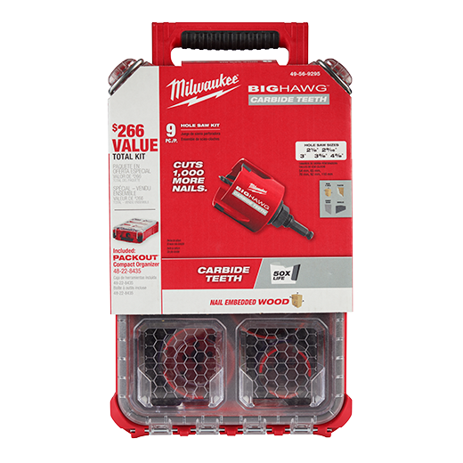 Hole Saw Kit - Milwaukee 9 PC BIG HAWG™ with Carbide Teeth Hole Saw Kit w/ PACKOUT™ Compact Organizer, 49-56-9295