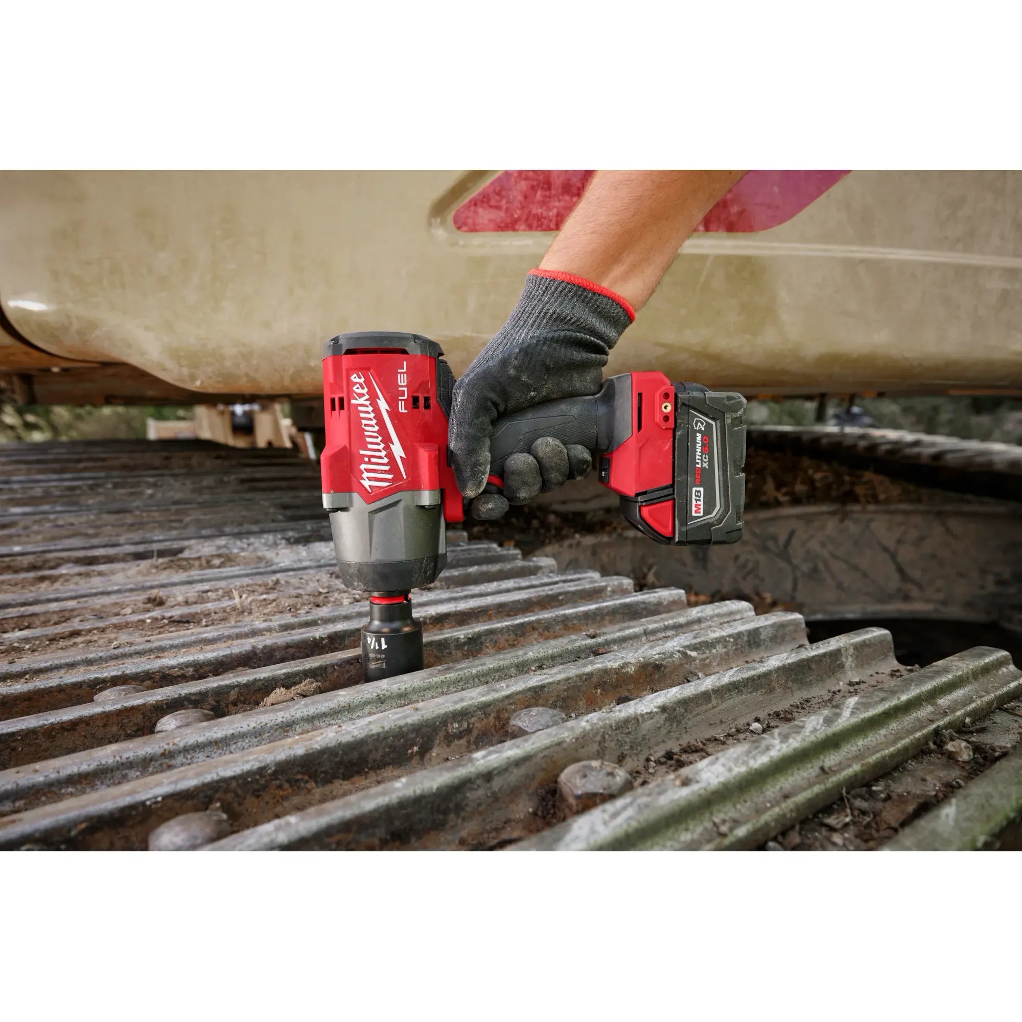 The M18 FUEL™ ½” High Torque Impact Wrench w/ Friction Ring Kit includes the most power-dense impact wrench in its class, provides greater access in tight spaces, and maximizes productivity through faster removal speeds. The POWERSTATE™ Brushless Motor delivers up to 1,100 ft-lbs of Fastening Torque and 1,500 ft-lbs of Nut-Busting Torque when paired with the M18™ REDLITHIUM™ XC5.0 Battery, while the compact size at 7.6" in length gives users greater access in tight spaces. The M18 FUEL™ ½” High Torque Impact Wrench w/ Friction Ring maximizes productivity on the jobsite and in the shop by removing stubborn bolts and fasteners faster than cordless competitors. The patented battery isolation system provides a secure battery connection and controls vibration transmitted to the pack. Tri-LEDs surround the anvil to deliver brighter light with fewer shadows. 4-Mode DRIVE CONTROL™ offers greater precision with a range of pre-set RPM and IPM levels, selectable from a single button on the tool. By selecting Mode 4, AUTO SHUT-OFF™ control applies no more than 50 ft-lbs of torque for hand-tight fastening applications to prevent overtightening. Mode 4 also features Bolt Removal Control that delivers users full torque output, then decreases RPMs once the bolt is loosened to prevent fastener drops. The ½” Friction Ring design allows for quick & tool-free socket changes. The M18™ REDLITHIUM™ XC5.0 Resistant Battery included provides increased protection against oils, greases, & solvents.
