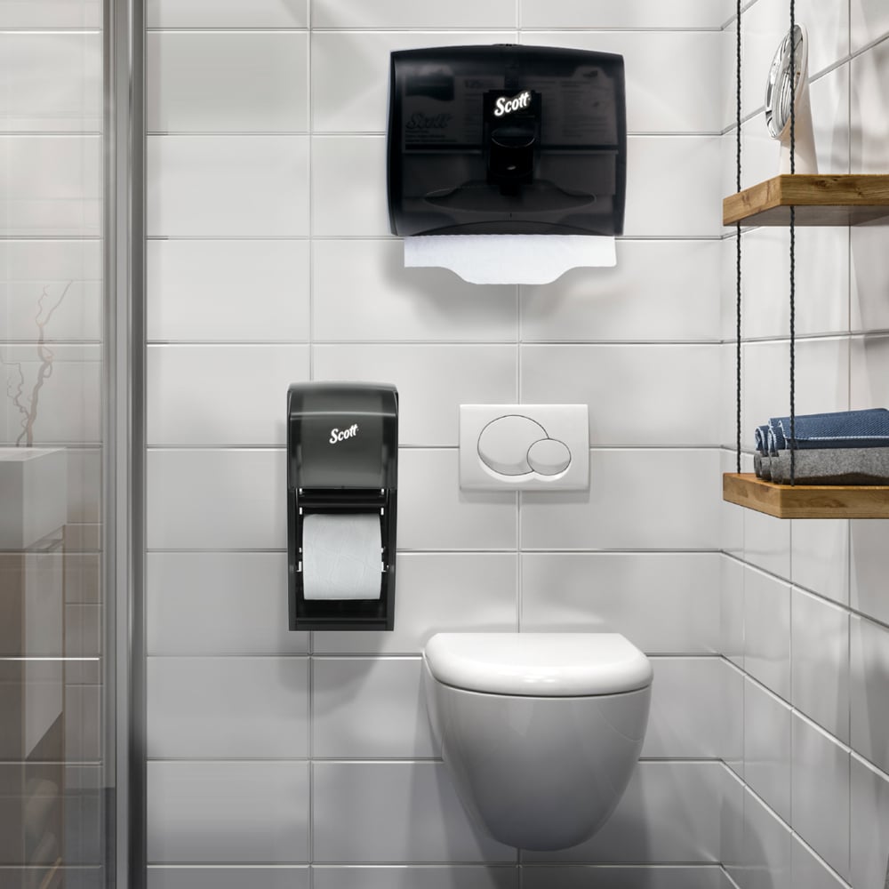 Scott® Essential provides reliable balance of efficiency, performance and value. When you need a sleek, toilet paper dispenser, the black (Smoke) Double Roll Dispenser from Scott® Essential is a great choice. The Double Roll Bathroom Tissue Dispenser offers a high capacity, easy maintenance system that can help lower maintenance costs. This system can be used with both cored and coreless standard bathroom tissue rolls from Kleenex® and Scott®Brand, since it includes appropriate adaptors for both types of rolls. It's easy to use and install and helps reduce waste by only allowing access to the reserve roll once the lower roll is completely used. It's ADA compliant when properly installed and features a lock to help reduce pilferage.