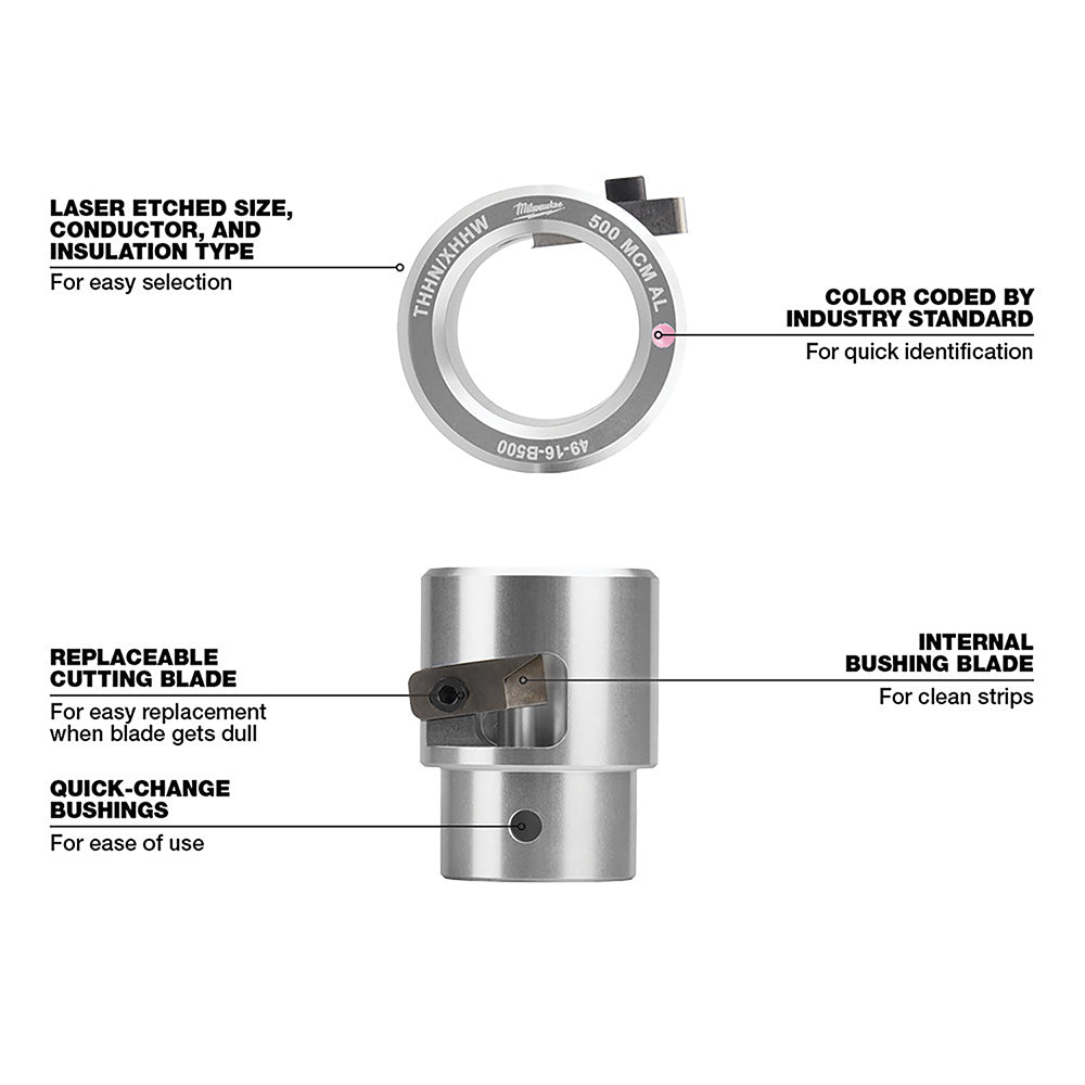 The Milwaukee® M12™ cable stripper kit for AL THHN / XHHW vastly improves the cable stripping experience. With no exposed blades, the cordless cable stripper provides safer stripping than with a knife. The cable stripper's compact, right-angle design enables users to maneuver it more easily in tight spaces with less strain on the wrist. The bushing design and adjustable depth gauge deliver cleaner, more accurate and consistent strips across all sizes. The cable jacket stripping tool is not only compatible with all Milwaukee bushings but is also compatible with competitive quick-change bushings. In addition to the battery-powered stripper, this kit contains 11 bushings for aluminum THHN and XHHW cables, one M12™ REDLITHIUM™ CP2.0 battery, an M18™ & M12™ multi-voltage charger, and a carrying case.