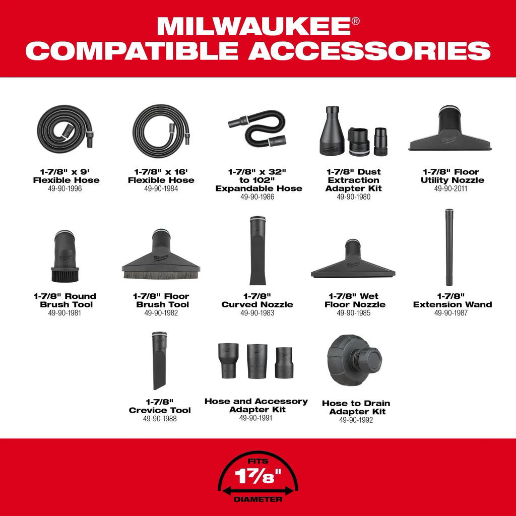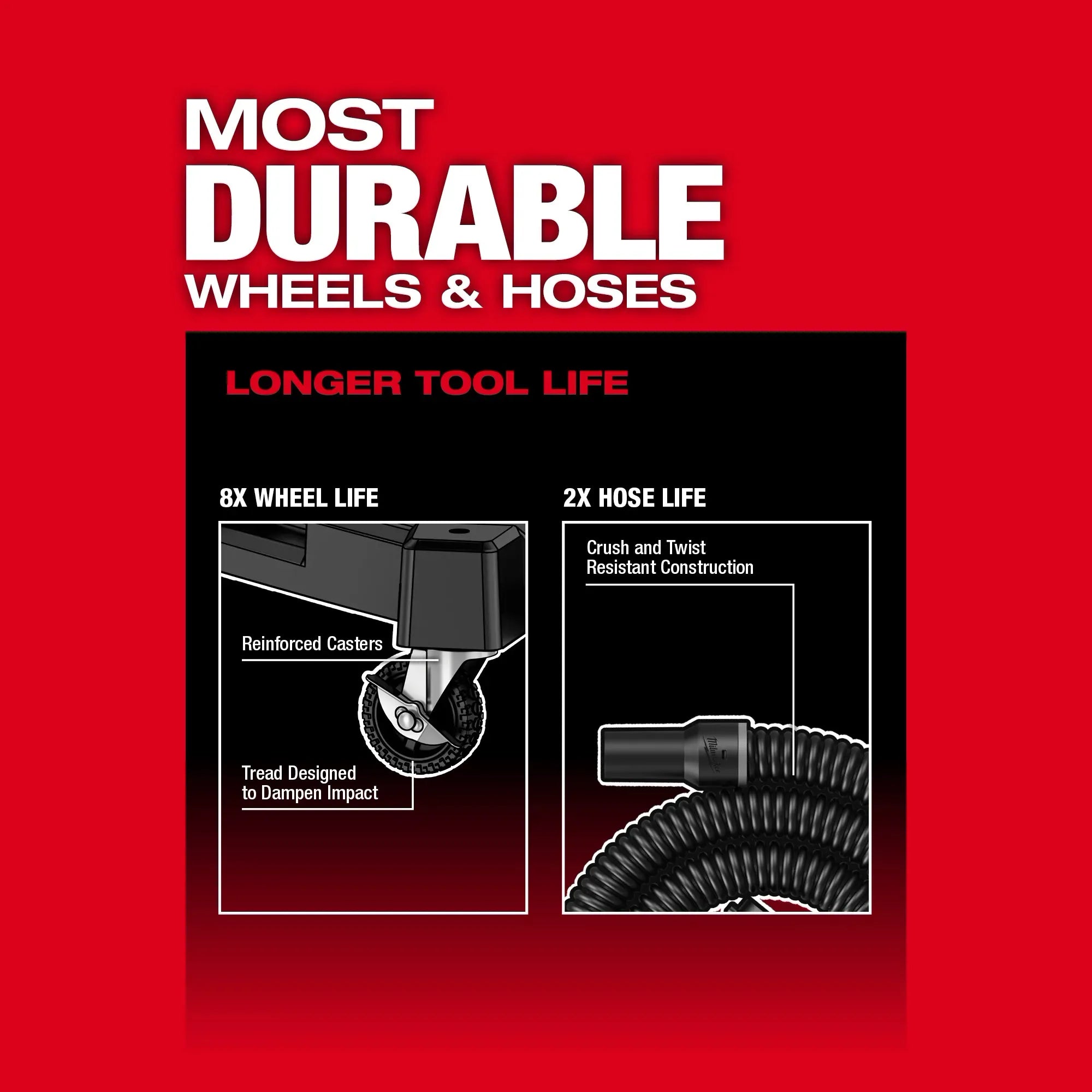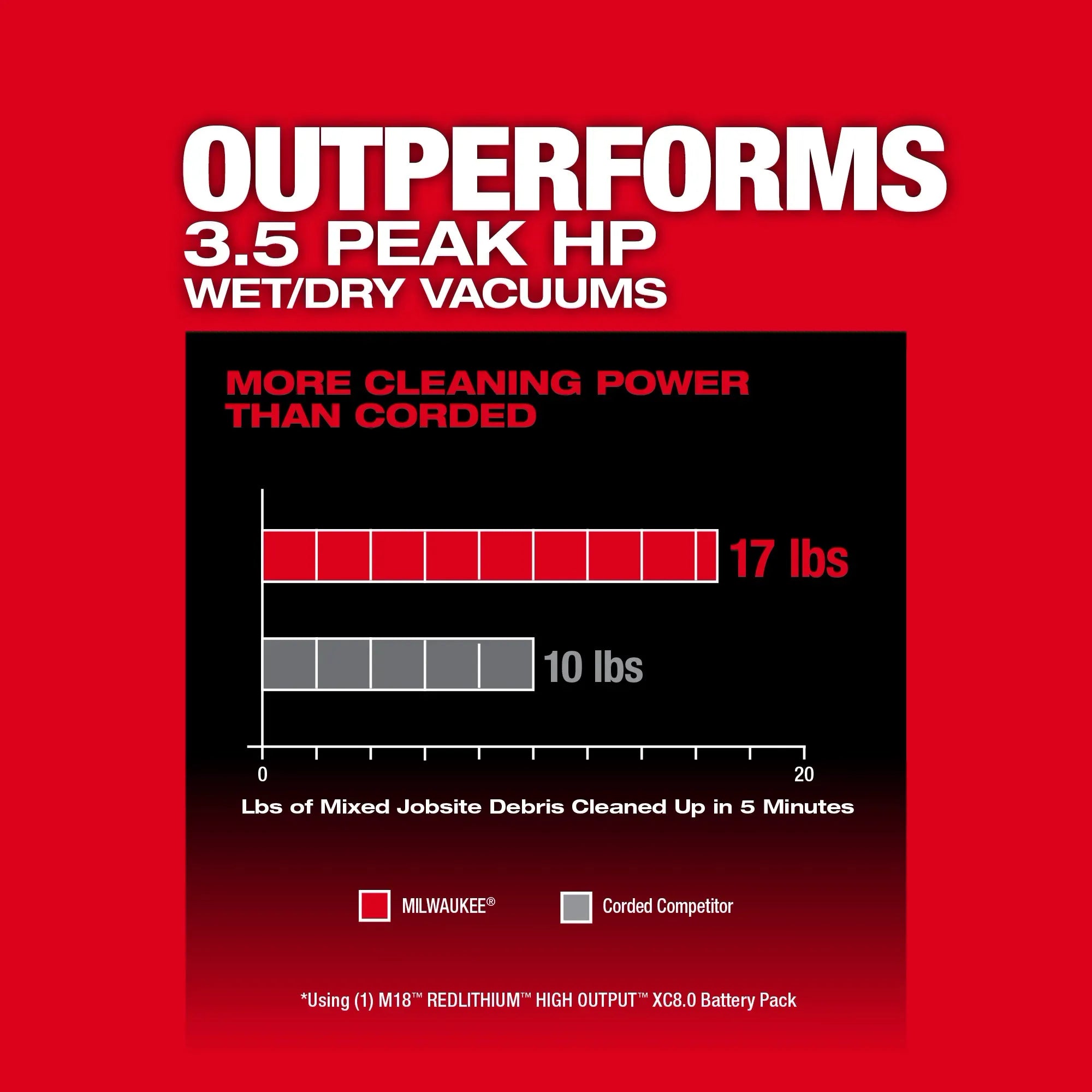The M18 FUEL™ 6 Gallon Wet/Dry Vacuum brings unmatched performance, durability, and versatility to jobsite cleanup. The POWERSTATE™ Brushless Motor and optimized components Outperform 3.5 Peak HP Wet/Dry Vacuums, delivering more cleaning power than corded. The wet/dry vac cleans up more common jobsite debris like drywall dust, concrete dust, and wood/metal shavings than 3.5 peak HP wet/dry vacuums in the same amount of time. This wet/dry vacuum provides you with the Most Durable Wheels and Hoses with reinforced casters and tread design for up to 8X wheel life. The crush and twist-resistant hose construction delivers up to 2X hose life. This vac is part of the Most Versatile Wet/Dry Vacuum System with interchangeable motor heads, tanks, and carts for varying performance, holding capacity, and mobility with the easy access foot pedal. MAX POWER MODE delivers up to 31 minutes of continuous cleaning time (up to 1,000 ft²) per charge on an M18™ REDLITHIUM™ HIGH OUTPUT™ HD12.0 Battery Pack. MAX RUN-TIME MODE delivers up to 47 minutes of continuous cleaning time (up to 1,300 ft²) per charge on an HD12.0 Battery Pack. The included Large High-Efficiency Filter ensures optimal dust and microparticle collection. You can use MILWAUKEE® Fleece Dust Bags for less debris build-up on the filter. Integrated accessory storage allows for easy access to the crevice tool and utility nozzle on the motorhead, with more accessory storage spots on the removable wet/dry vacuum cart.