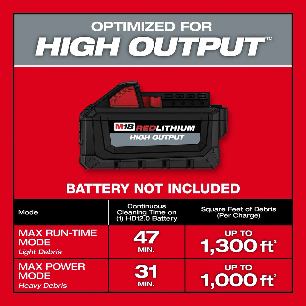 - MAX POWER MODE delivers up to 31 minutes of continuous cleaning time, and up to 1,000 ft2 of debris clean up per charge on a M18™ REDLITHIUM™ HIGH OUTPUT™ HD12.0 Battery Pack
