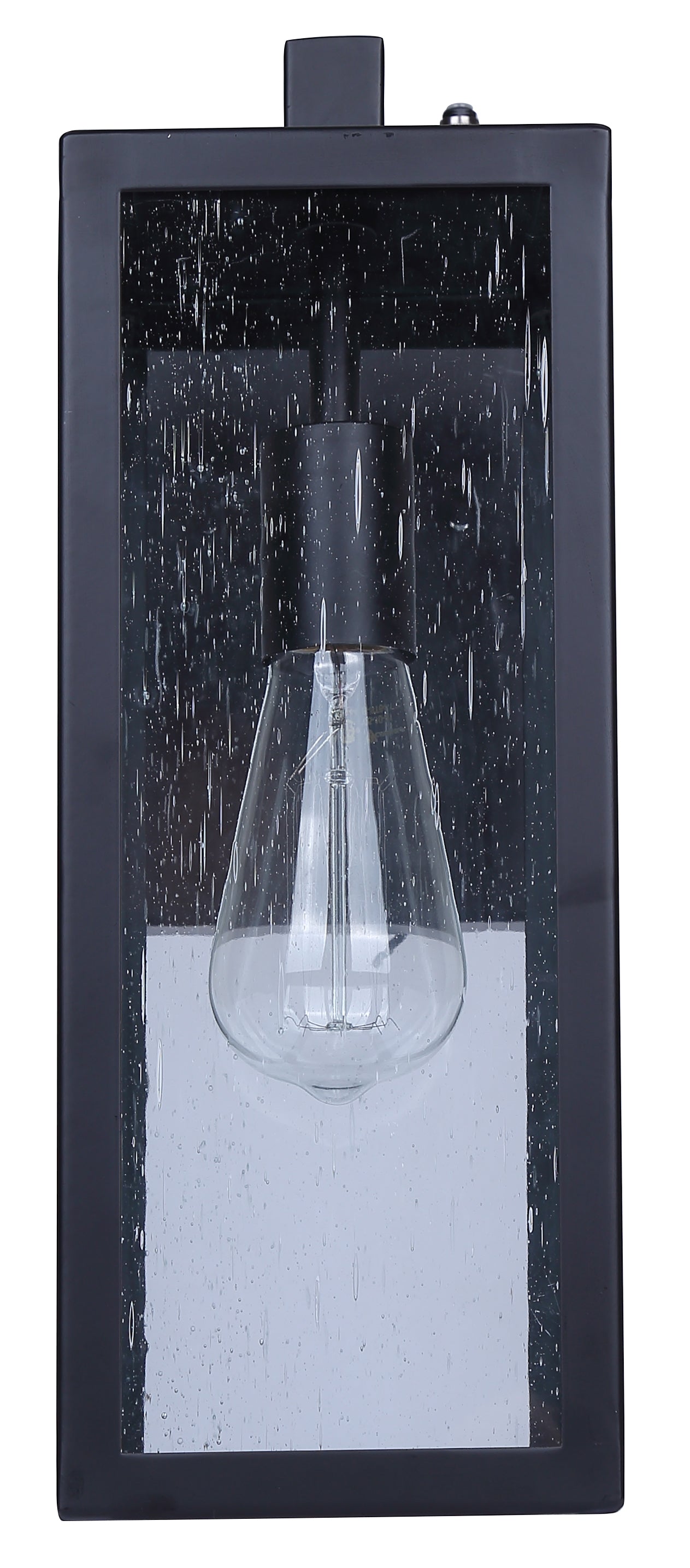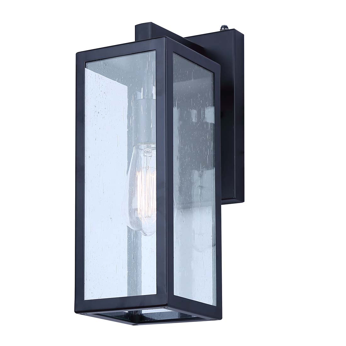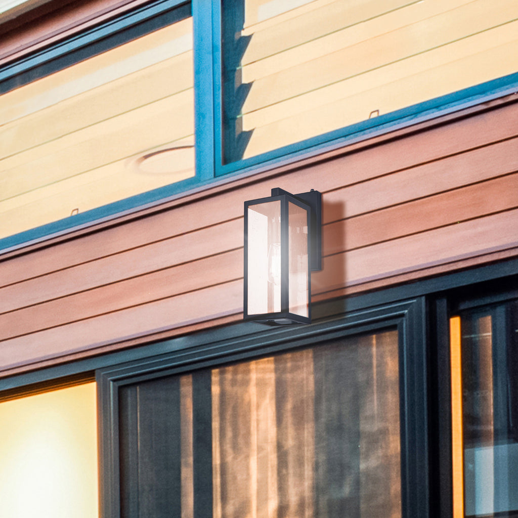 The ALAINA outdoor wall light is an elegant and practical enhancement for your outdoor area. Ideal for brightening entrances or patios, this contemporary fixture seamlessly blends style with utility. ALAINA's rectangular design infuses a modern touch, while its seeded glass panels and chic black finish evoke a cozy and welcoming atmosphere. For optimal security, the Alaina wall light includes a photocell for dusk-to-dawn operation, ensuring effortless illumination throughout the night.