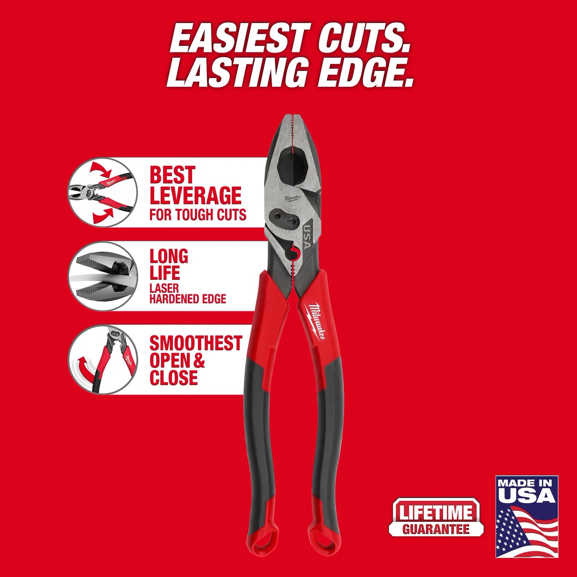 The Milwaukee® 9” Lineman’s Pliers with Crimper and Bolt Cutter (USA) are designed with the Electrician in mind, delivering the easiest cuts and a lasting edge. The pliers are designed with an optimized pivot point to provide the best leverage for tough cuts through materials like wires and common hardware. The Lineman’s cutting pliers deliver the confidence of a long cut life and maximum grip with laser-hardened edges and teeth. The Lineman’s Pliers are engineered to deliver the smoothest open and close experience from the start, with no break-in period required. To complete common electrical applications with fewer tools, the pliers include an integrated crimper for insulated and non-insulated terminals and #6 and #8 bolt cutters. For additional versatility, the Lineman’s Pliers include a reaming head for ½-inch to 1-inch conduit and a straight fish tape puller. The pliers are tether ready and offered in both dipped grip with a split-ring hole and comfort grip with a lanyard hole. The Milwaukee Lineman’s Pliers are made in USA with best-in-class manufacturing technology and USA-sourced materials, including durable, press-forged steel, and are backed by a complete Lifetime Guarantee.