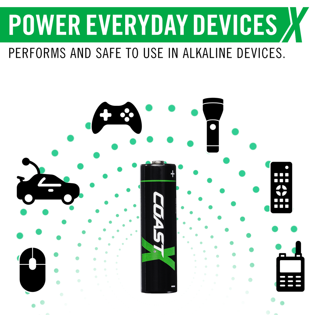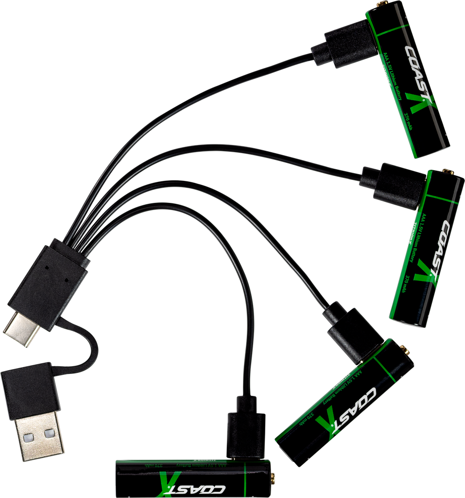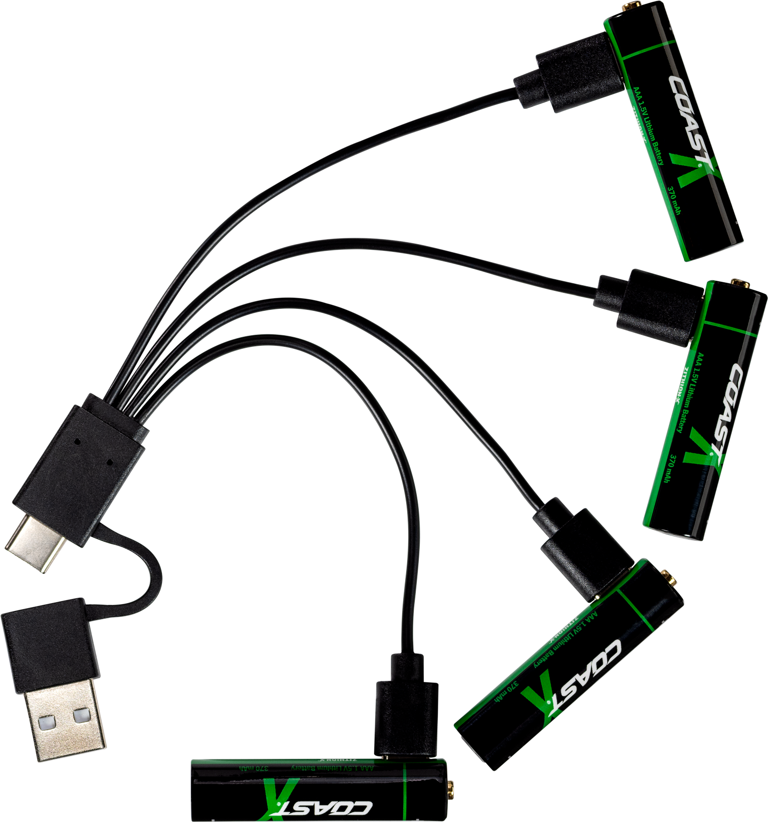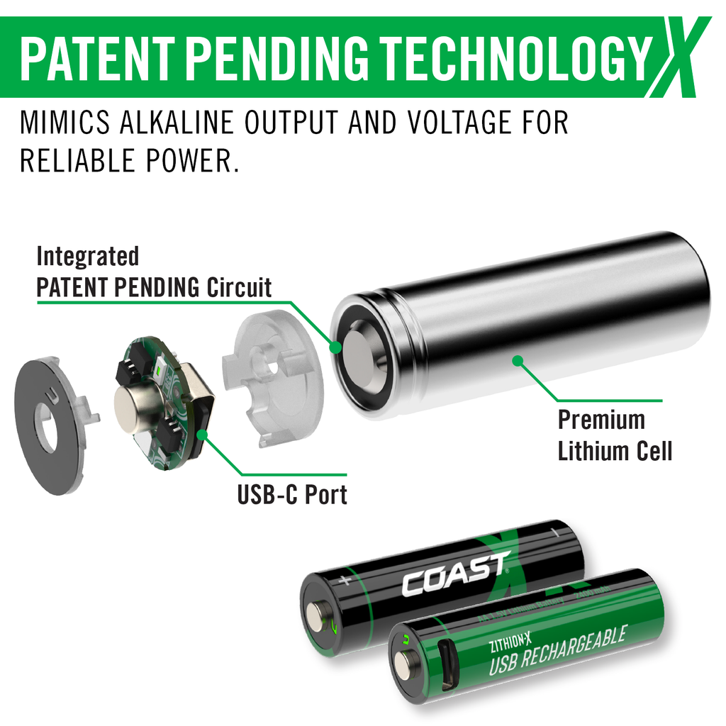 Pack power with purpose. COAST ZITHION-X® rechargeable lithium batteries change the game in responsible, portable power technology. Advanced engineering provides a comprehensive upgrade compared with other sources of battery power—delivering long-lasting run times for a clear performance advantage over standard rechargeable lithium and NiMH batteries. To mimic the broad compatibility of alkaline batteries, proprietary COAST ZX Optimized Voltage™ allows ZITHION-X® batteries to modulate their power supply up or down based on the need and prevent flickering, overheating, and damage to products. The leak-resistant battery casing prevents corrosion during use—matching performance with protection. Connect conveniently via USB-C to recharge quickly and forget about special charging cables and cradles. Every ZITHION-X® can be recharged many times, resulting in significant cost-savings compared with single-use disposable batteries while keeping hundreds of batteries out of the landfill.