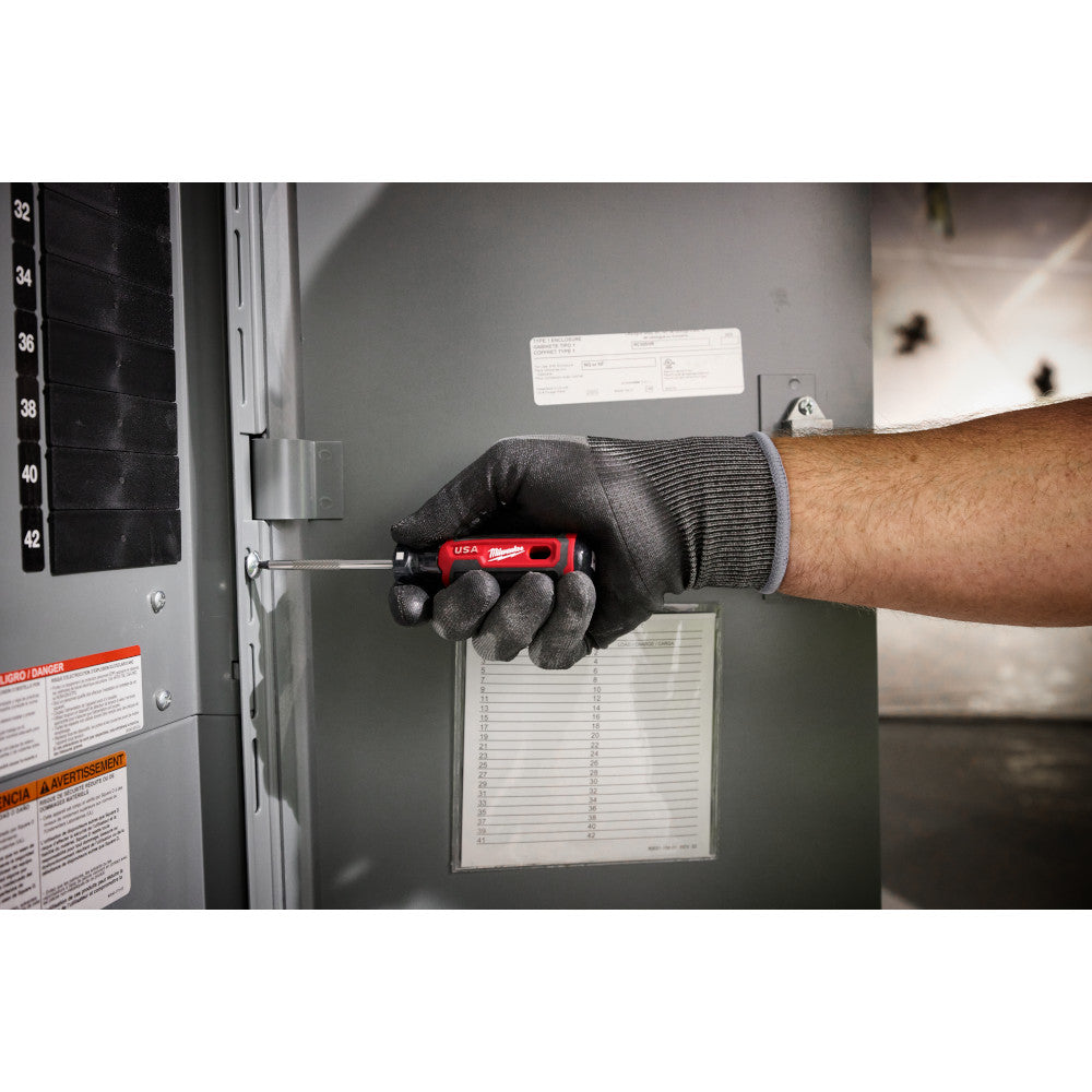 The Milwaukee® #1 Square 3" Cushion Grip Screwdrivers (USA) are manufactured to give the professional the best-fitting screwdriver with max grip. These screwdriver tips are custom machined to deliver a precise fit and reduce stripping during demanding fastening applications. For added confidence, the tips are laser etched to increase the gripping surface. Manufactured with high-strength boron-infused steel for increased hardness, these screwdrivers stand up to the demands of the site with ultimate durability and life. Providing increased versatility, select screwdrivers include a wrench-ready bolster for added torque and a knurled shank for precision control. Quick identification markings on the handle make it easy to identify screwdriver tip size, including Phillips, cabinet, ECX, slotted, and square. The demolition screwdrivers also include a hammer-ready strike cap. These screwdrivers range in shank sizes from 3-inch to 10-inch. Milwaukee Cushion Grip Screwdrivers (USA) are made in the USA with best-in-class manufacturing technology and USA-sourced materials all backed by a complete Lifetime Guarantee.