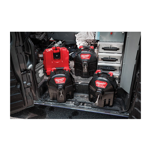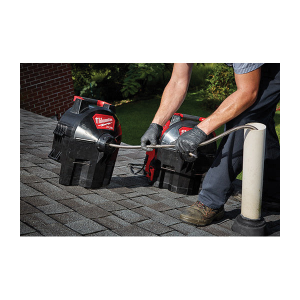 M18 FUEL™ SWITCH PACK™ Sectional Drum System 5/8" Kit is the first drain cleaning solution that combines the benefits of sectional and drum machines, creating the single most versatile and mobile machine on the market. The drain cleaning machine allows you to tackle the most frequent challenge of any drain cleaning application - getting the machine onto the job. The SWITCH PACK™ System utilizes a modular design with backpack straps allowing you to easily transport it to any roof, drain, crawl space or cleanout. The tool-free drum connection allows you to quickly switch between cable sizes or add a second drum, allowing you to reach 100' down the line. All MILWAUKEE® SWITCH PACK™ drain cleaning drums are fully enclosed providing you with the best protection against job site mess. The POWERSTATE™ Brushless Motor provides you with more clearing power than corded units for tough jobs in up to 4" drain lines. Built-in REDLINK PLUS™ Intelligence improves your control with an integrated drum brake, slowing the machine up to 5X faster than competitor drums. Our M18™ REDLITHIUM™ battery pack powers through multiple jobs on a single charge, providing cordless mobility, safety, and power supply to the drain cleaning industry. The 5/8" Open Wind cable is best for use on 1-1/4" - 3" drain lines. Other cable sizes also available. The SWITCH PACK™ is also compatible with our CABLE DRIVE™ Assembly (47-53-2774) that allows you to automatically feed and retract cable up to 15-20 feet per minute. The CABLE DRIVE™ assembly quickly attaches to and swaps between any Milwaukee SWITCH PACK™ Drum with the Mounting Plate (47-53-2773) installed.