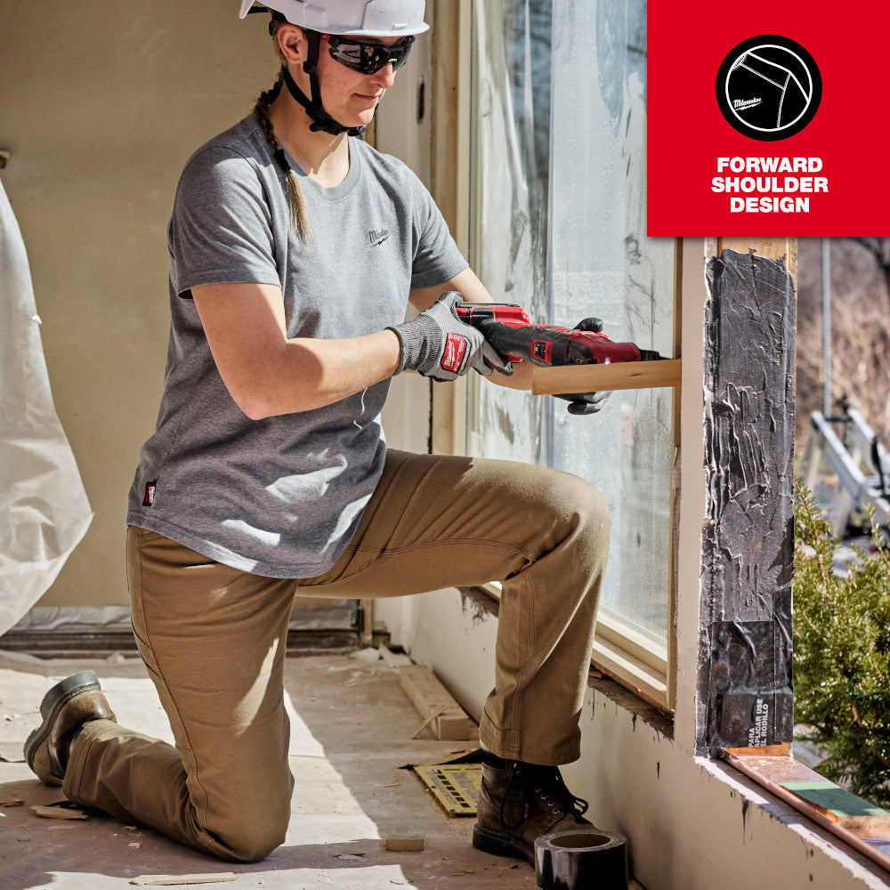 Part of Milwaukee's FREEFLEX™ Collection, the Women’s short sleeve Hybrid Tee is BUILT FOR MOVEMENT so tradeswomen can work and layer easily. The FREEFLEX™ Hybrid Tee is engineered for mobility with natural stretch and a forward shoulder design, while not sacrificing on durability. Complete with moisture-wicking technology, the breathable cotton/poly blend keeps you comfortable while working. MILWAUKEE® FREEFLEX™ products are developed in collaboration with feedback from users across the trades through continuous jobsite research.
