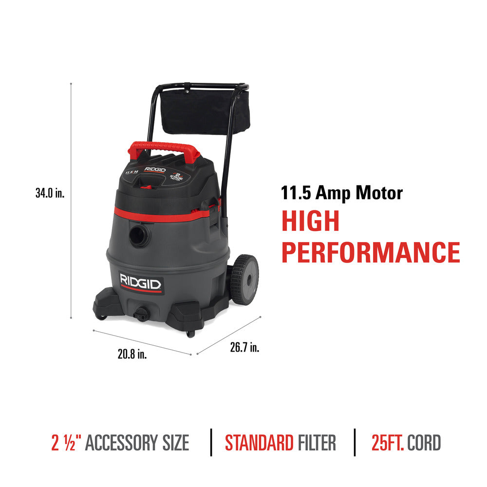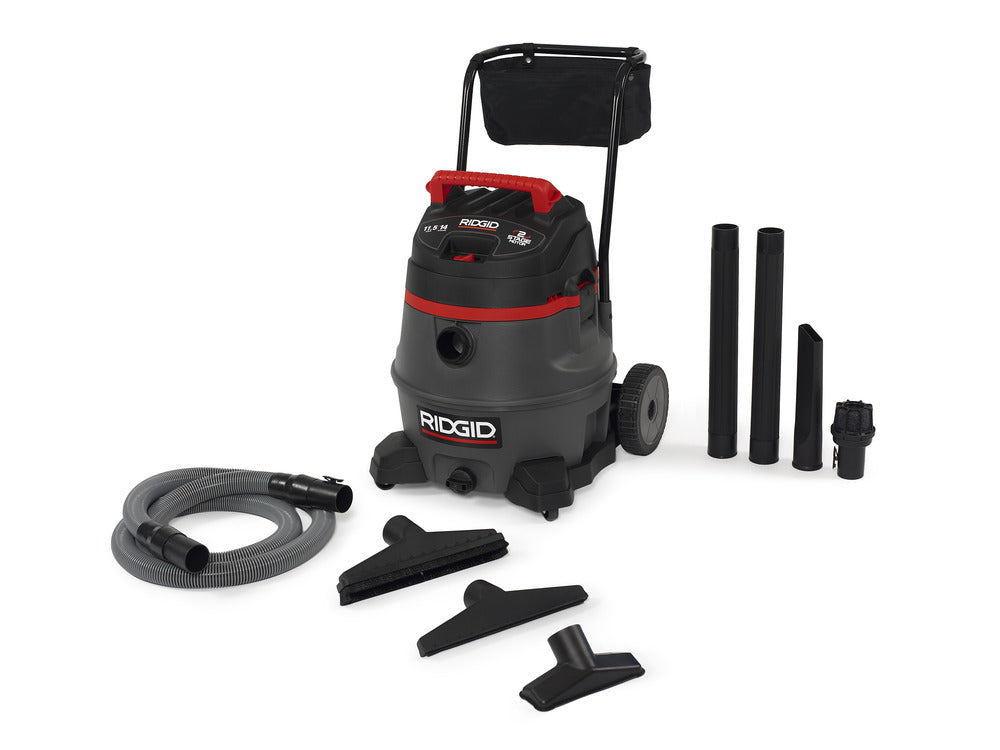 The RIDGID® Model RV2400A professional wet dry shop vac is a 14-gallon, 2-stage industrial wet dry vac delivering high-lift suction, large capacity, rugged construction, and excellent mobility for pro, contractor, and industrial use. The dual blower wheel is driven by an 11.5 amp motor to efficiently handle the toughest wet or dry work site cleanup tasks.