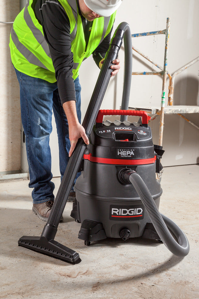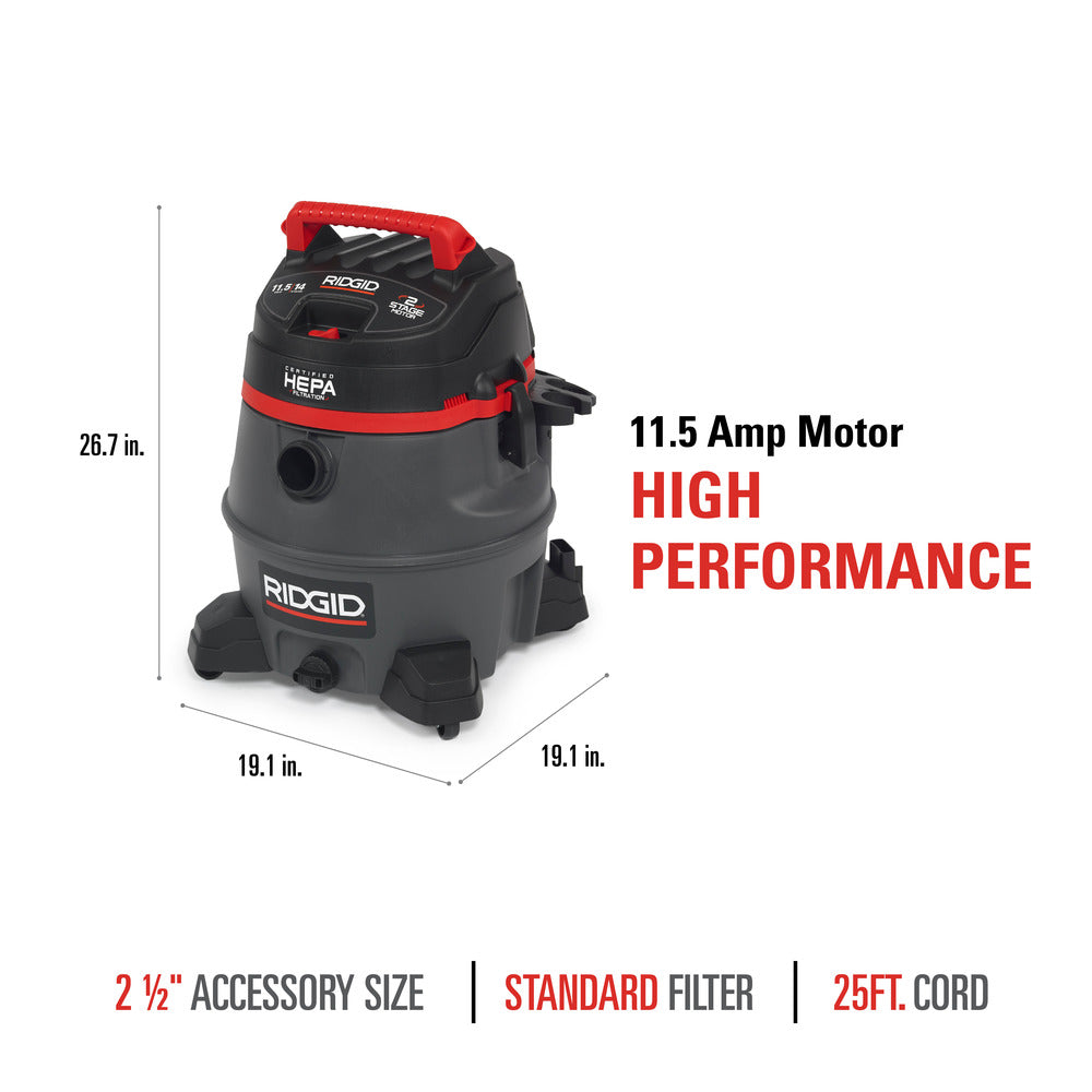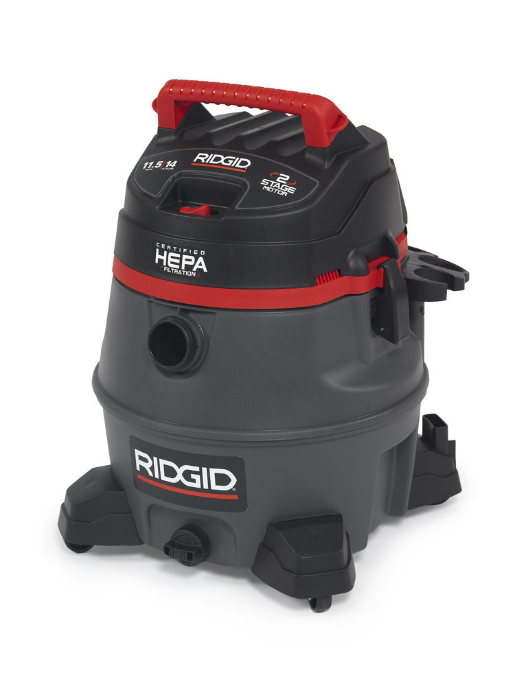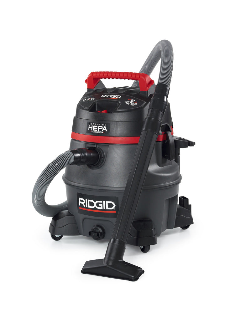 The RIDGID® Model RV2400HF professional wet dry shop vac is a 14-gallon, 2-stage wet dry vacuum with certified HEPA Filtration that meets EPA’s definition under the RRP rule for lead paint renovations. It delivers the high-lift suction, large capacity, rugged construction for pro, contractor and industrial use.
