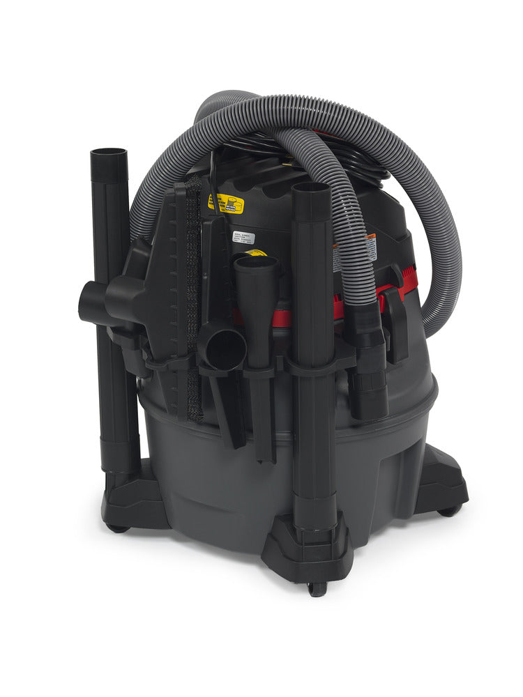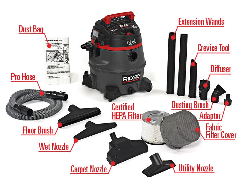 Includes - Vacuum, owner's manual, 2 extension wands, 2 1/2” x 10’ premium locking pro hose, utility nozzle, wet nozzle, 14” floor brush, crevice tool, muffler/diffuser, filter bag, cloth pre-filter, certified HEPA filter, “beater bar” turbo brush with connector, locking accessories, and dusting brush.